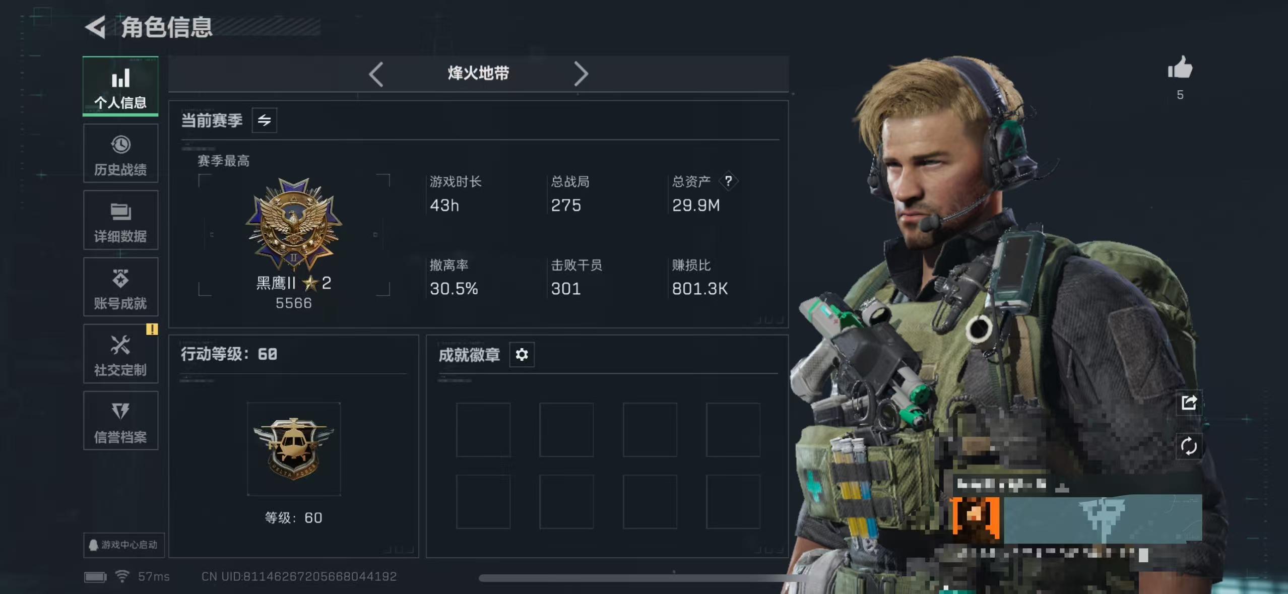 总价值29.8M-哈夫币315k-烽火地带等级60-烽火地带段位黑鹰