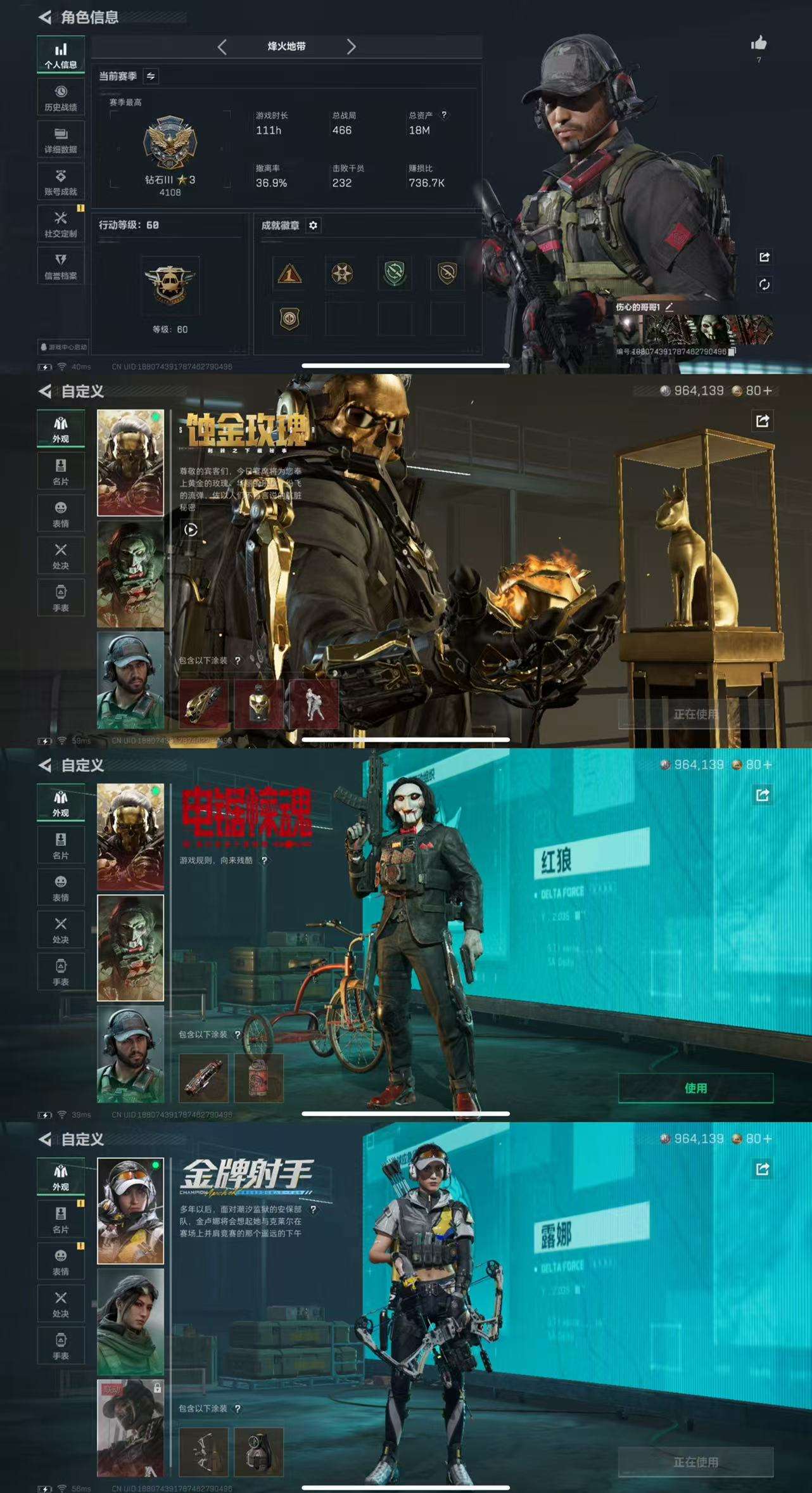 1红皮-蚀金玫瑰-2金皮 烽火等级60总资产18M 哈夫币2677K