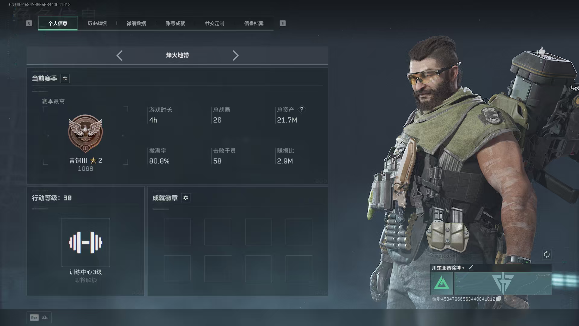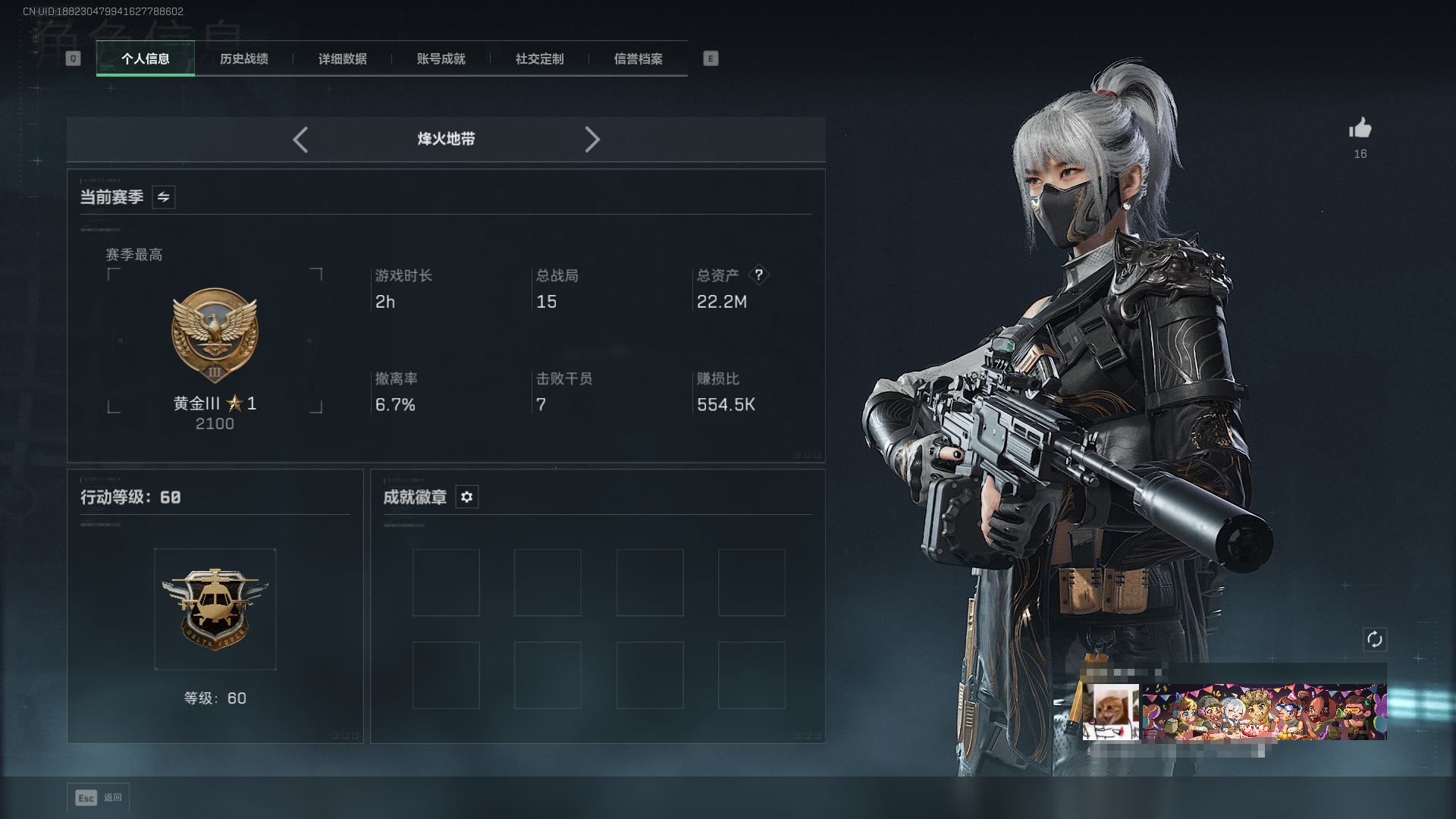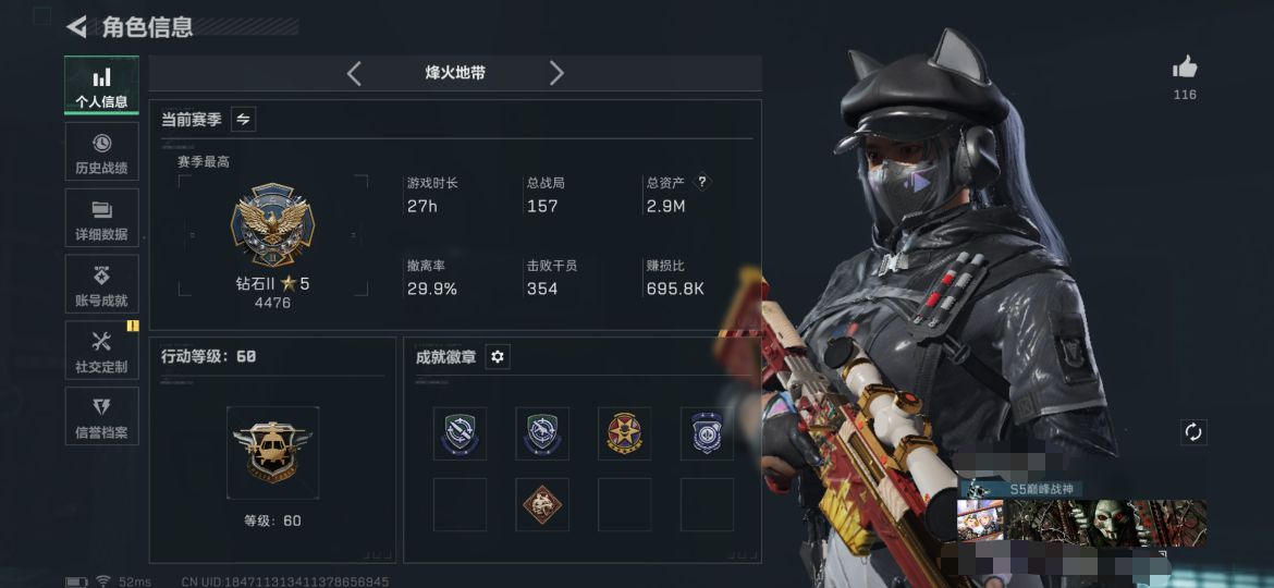 149m+等级60+北极星+蚀金玫瑰+赛季3*3+训练7靶场4仓库7 烽火地带段位: 钻石 全面战场段位: 列兵 总资产: 149000000 哈夫币: 679000