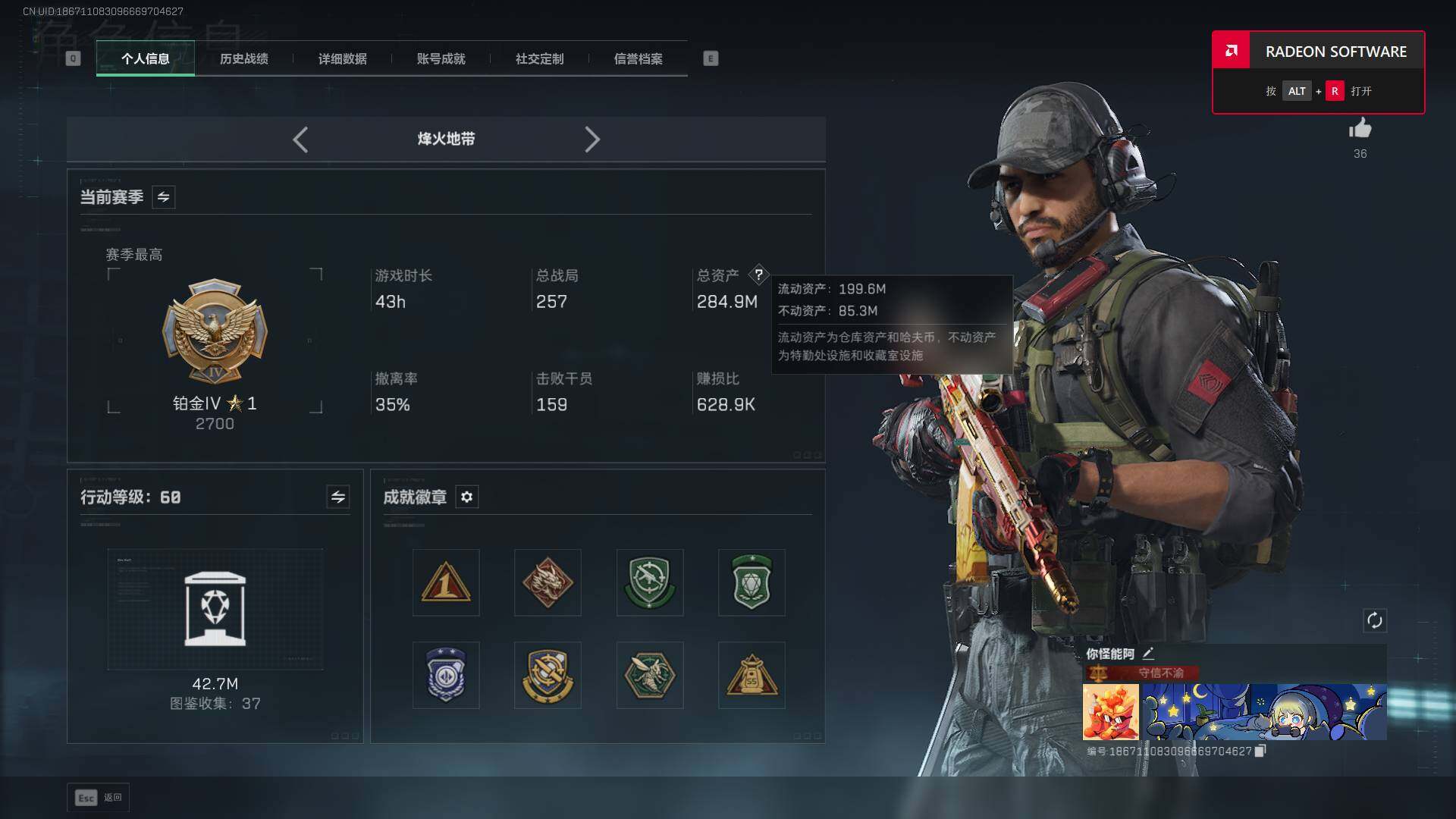 等级60级 仓库价值65M 哈夫币1284K 干员皮肤1 红狼 电锯惊魂