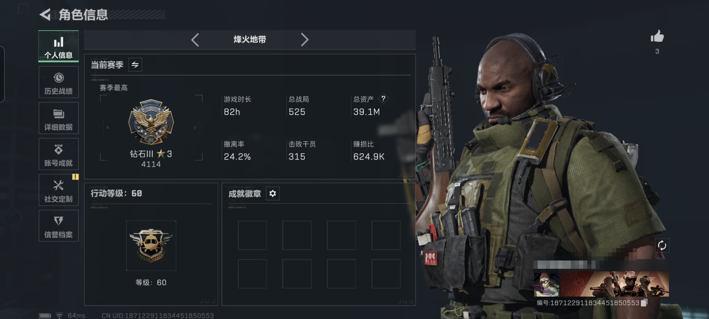 总价值33.2M-哈夫币525k-烽火地带等级60-烽火地带段位黑鹰