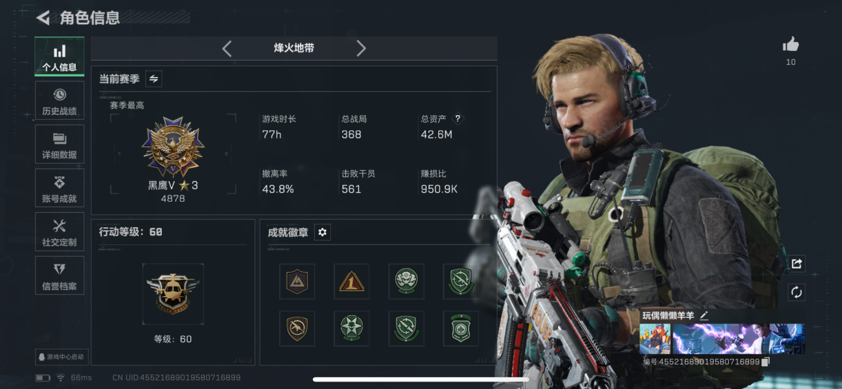【总资产(M)】66.05【哈夫币】2939k【行动等级】60