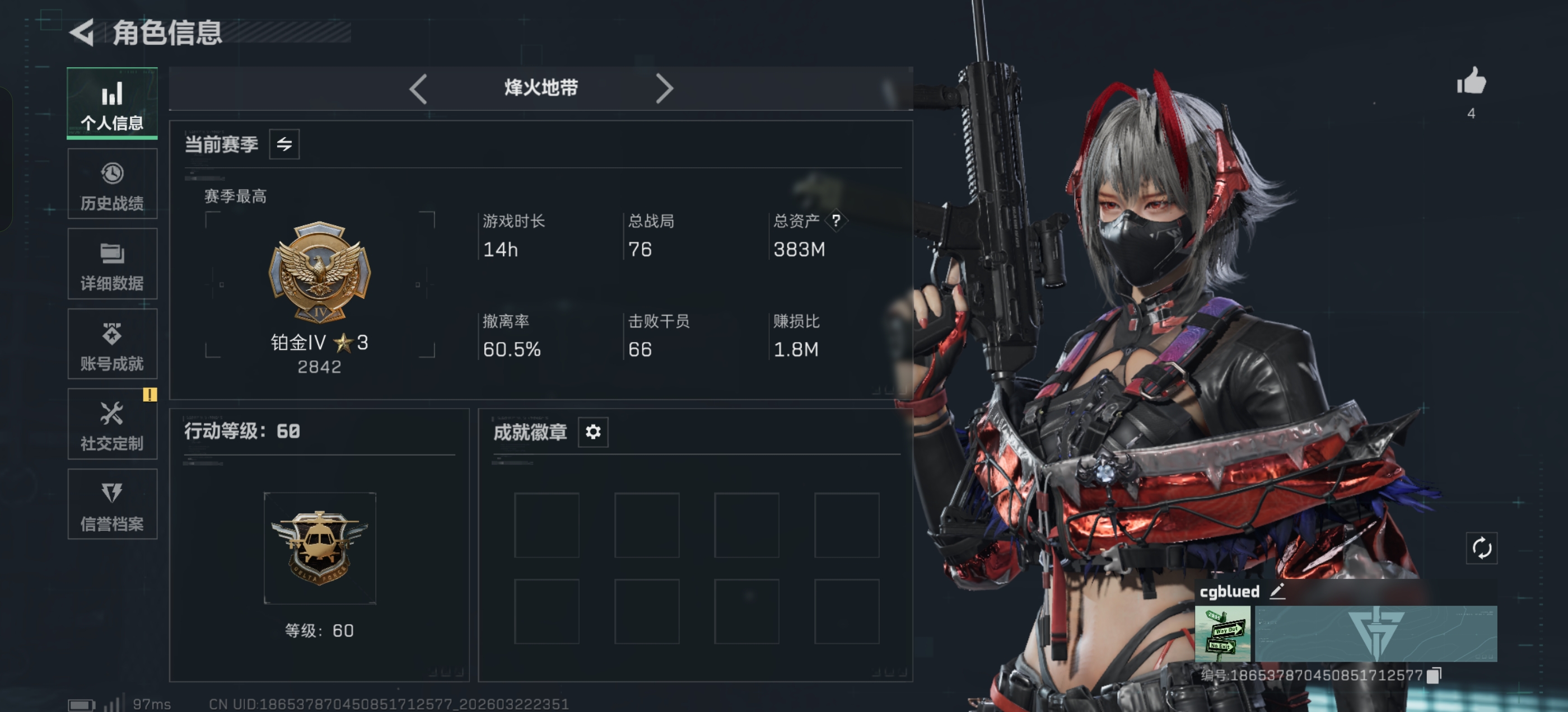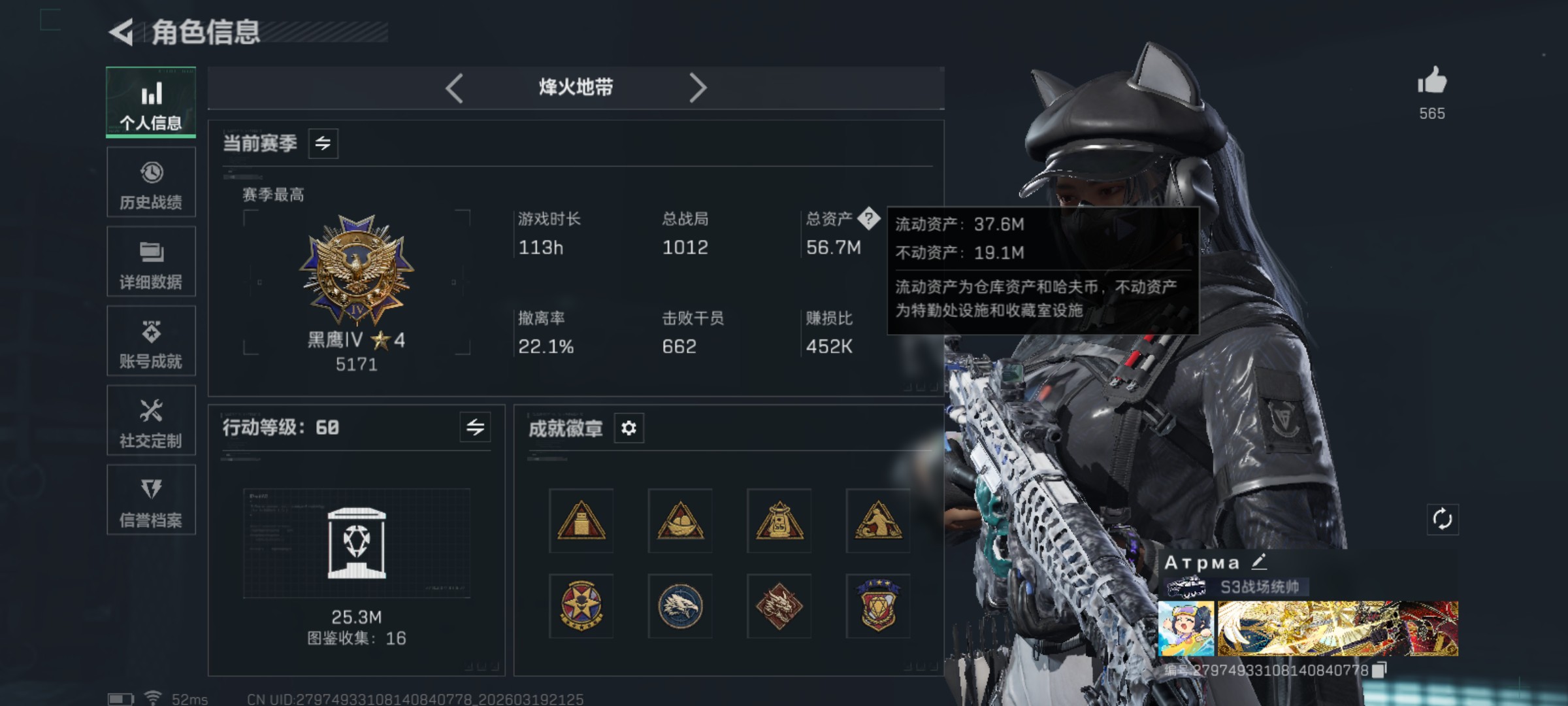1113m总资产-564457k哈夫币-60烽火等级-黑鹰-26战场等级-列兵