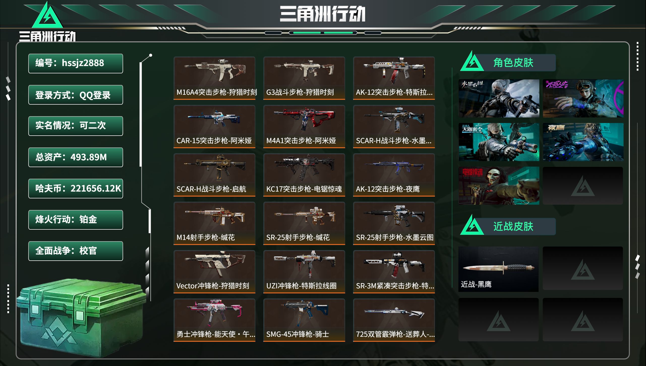 总资产493.89M,哈夫币 .12K,战场等级:50 校官,行动等级:60 铂金,角色皮肤5,枪皮数量200