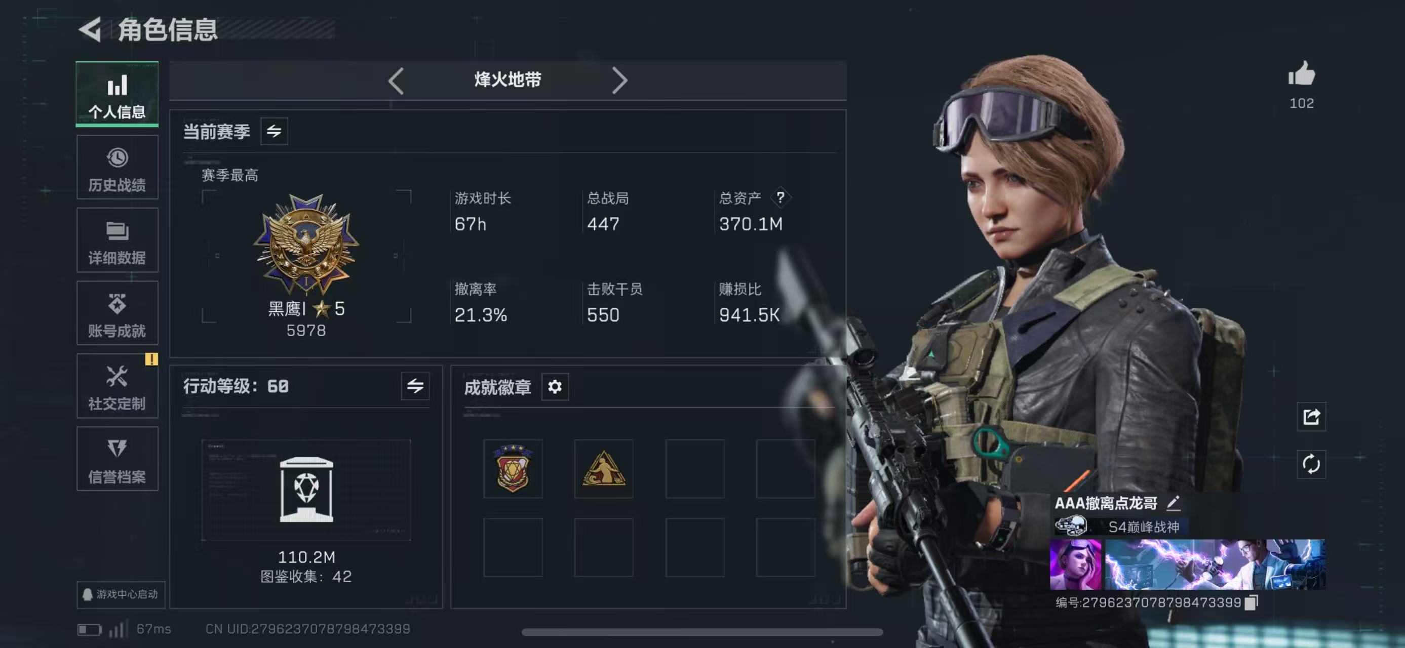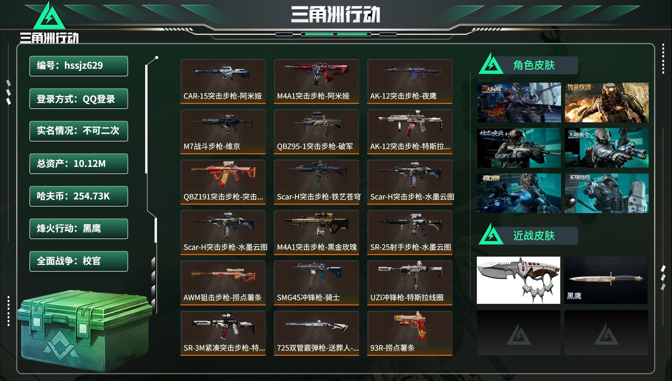 总资产10.12M,哈夫币 254.73K,战场等级:50 校官,行动等级:60 黑鹰,角色皮肤8,