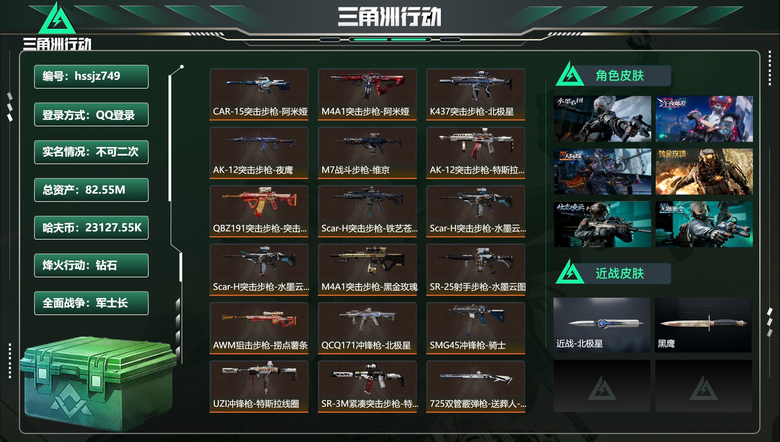 总资产82.55M,哈夫币 23127.55K,战场等级:49 军士长,行动等级:60 钻石,角色皮