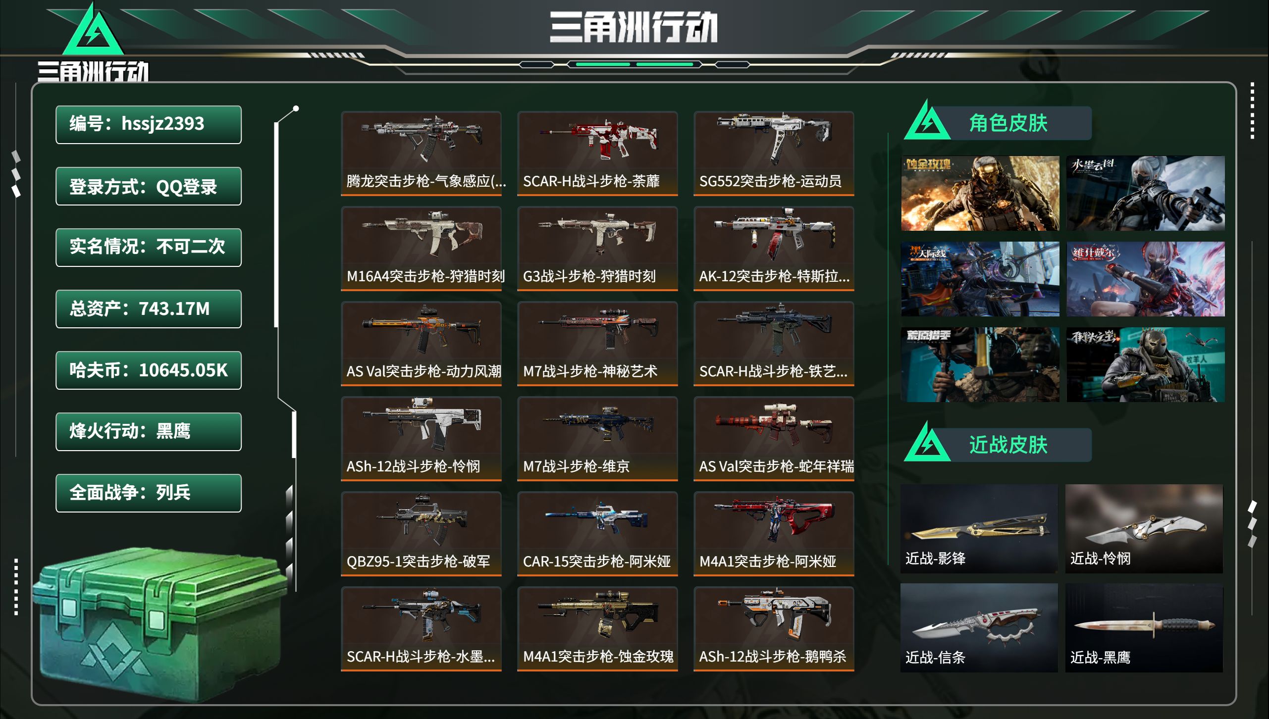 总资产743.17M,哈夫币 10645.05K,战场等级:9 列兵