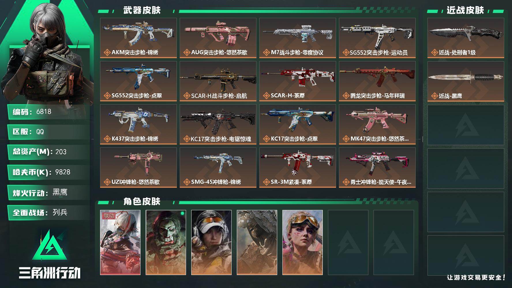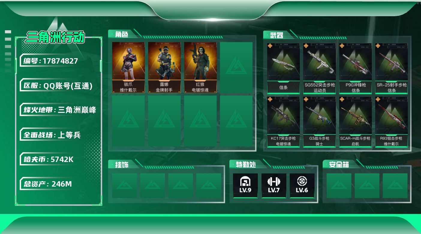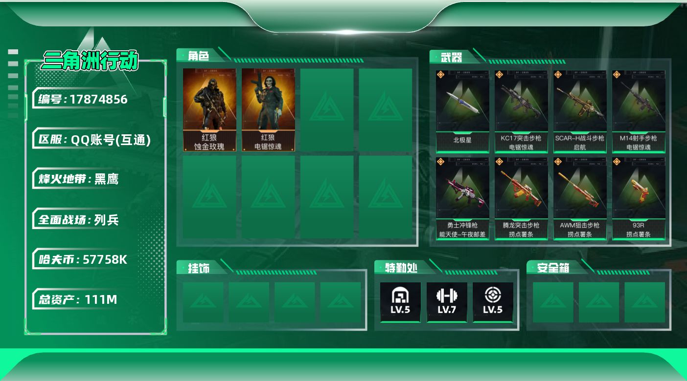 总资产:149.7M 3干员外观 2近战传说 35传说枪械 哈夫币:55.655 不可修改实名 顶级安全箱4.15到期