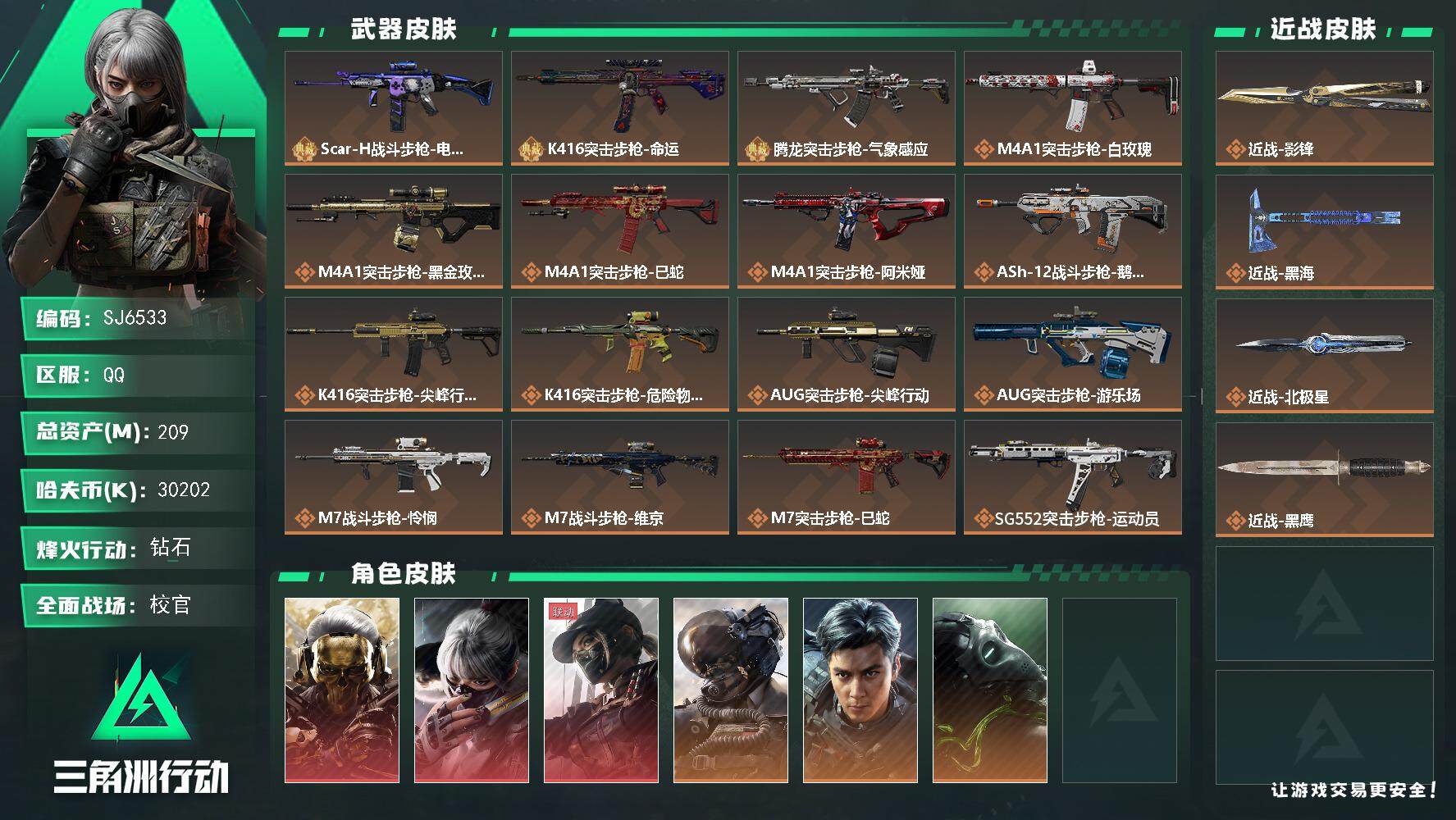 总资产(M):209M/哈夫币(K):30202K/传说枪皮数:52/全面战场等级:50_段位:校官/烽火地带等级:60_段位:钻石/