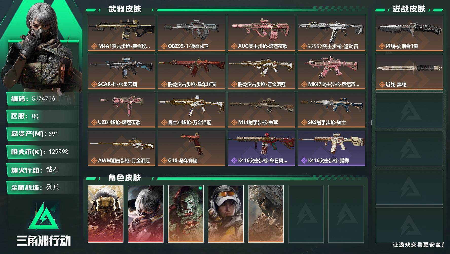总资产(M):391M/哈夫币(K):129998K/传说枪皮数:14/全面战场等级:34_段位:列兵/烽火地带等级:60_段位:钻石