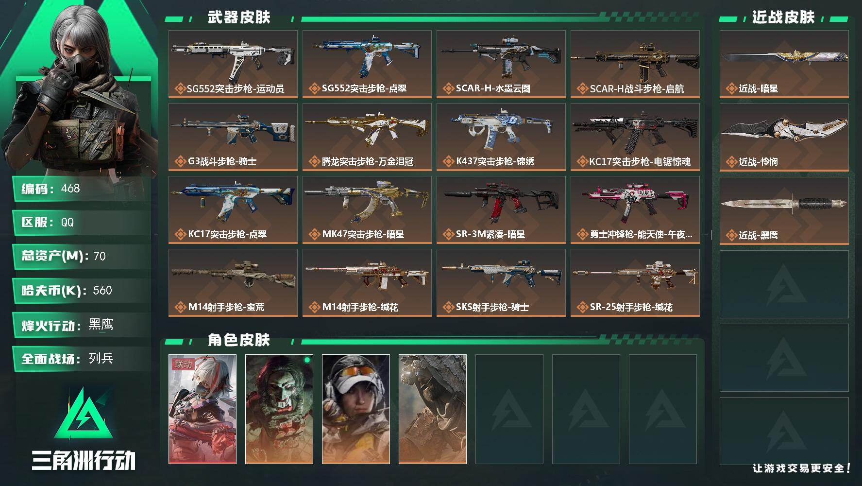 70m总资产-560k哈夫币-60烽火等级-黑鹰-23战场等级-列兵 YY20