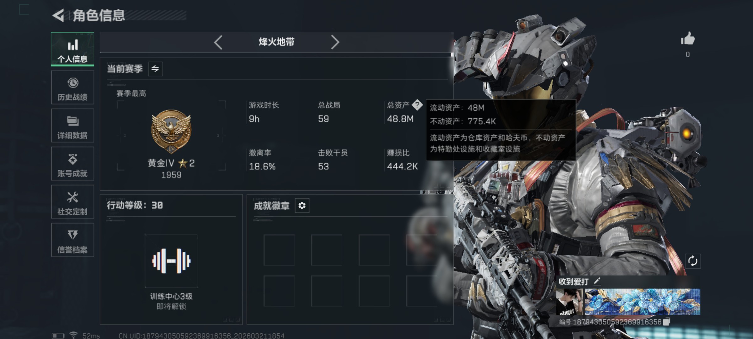 哈夫币:21524915 干员外观数:1 近战数:3 枪械数:53 载具数:7 烽火地带等级:30 全面战场等级:1 烽火地带段位:黄金