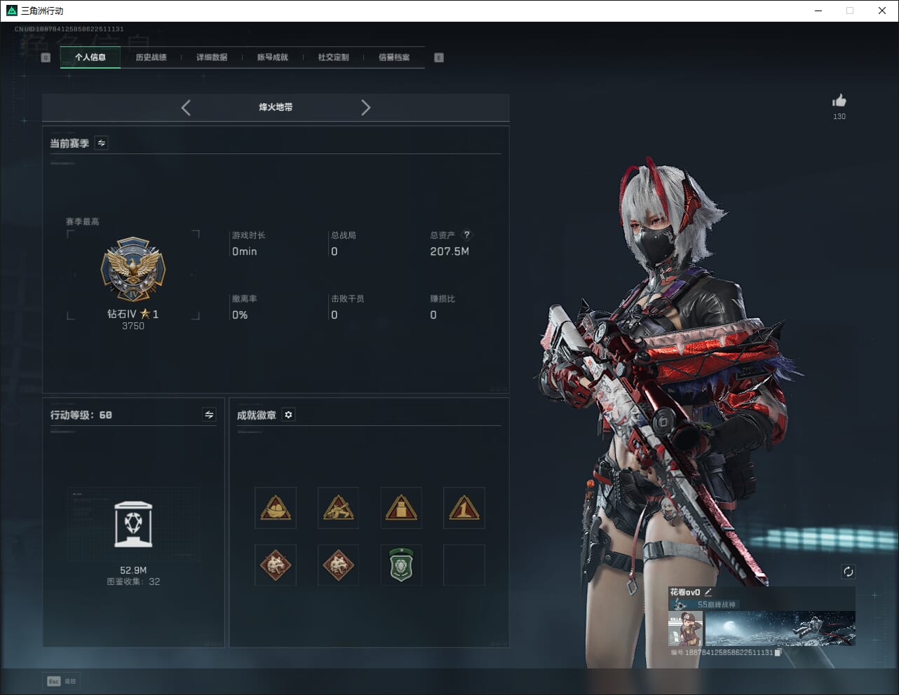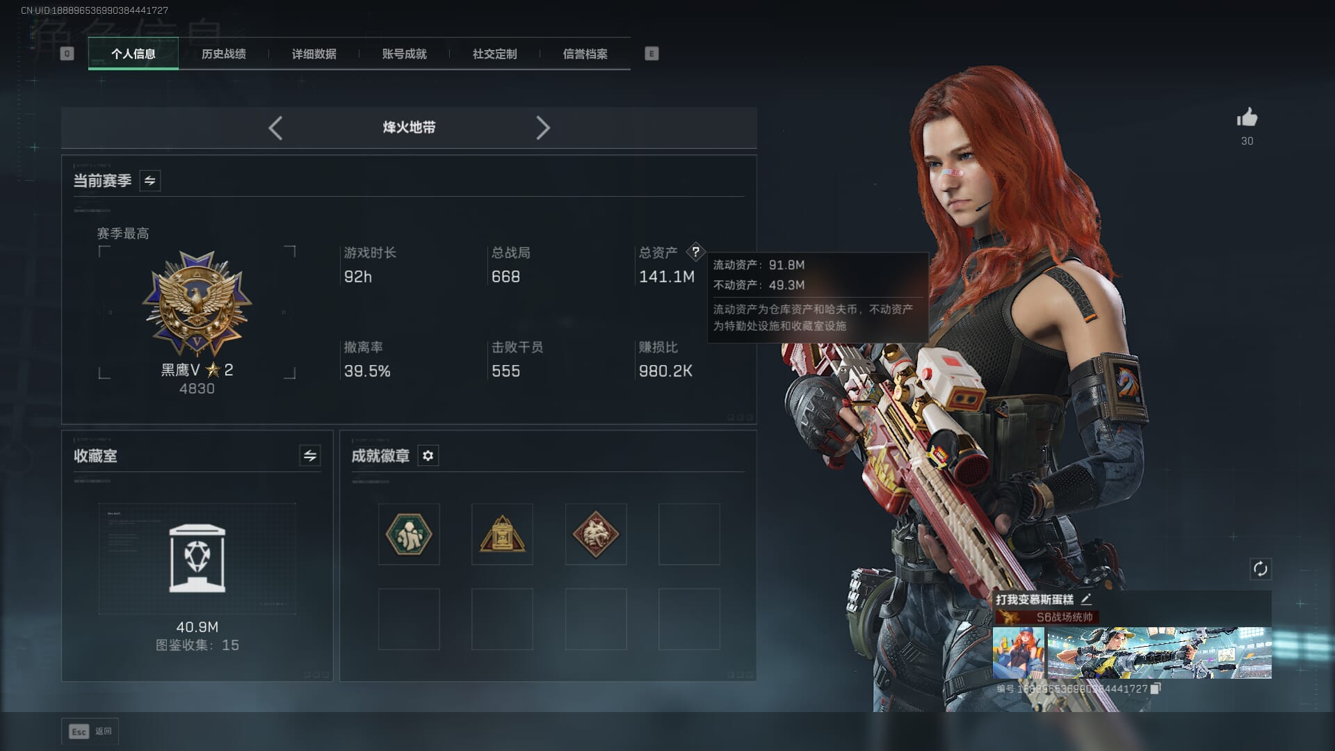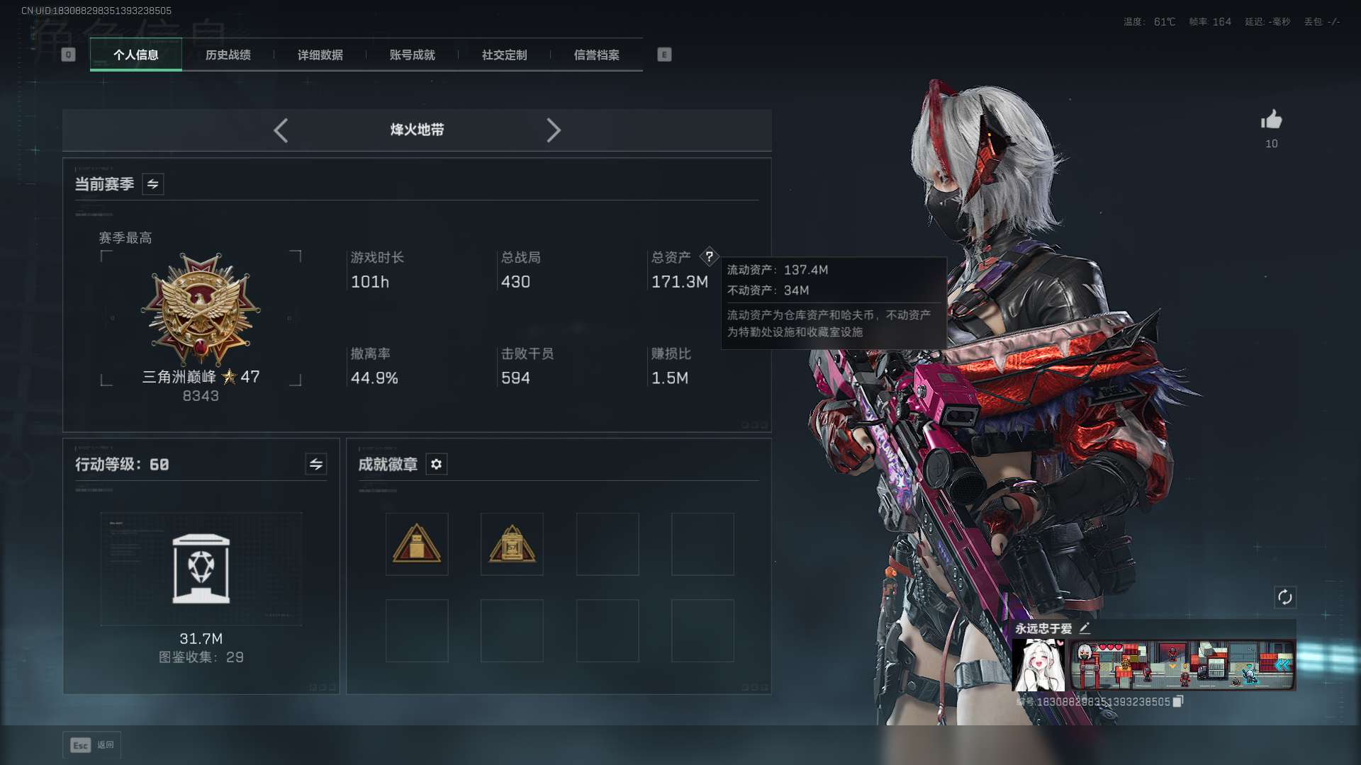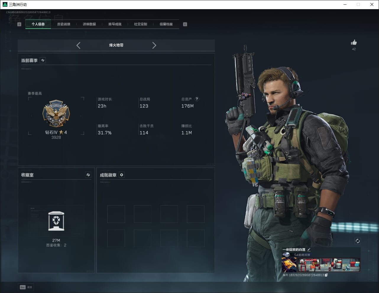 41m总资产-1335k哈伏币-60烽火等级-铂金-1战场等级-无军衔【干员