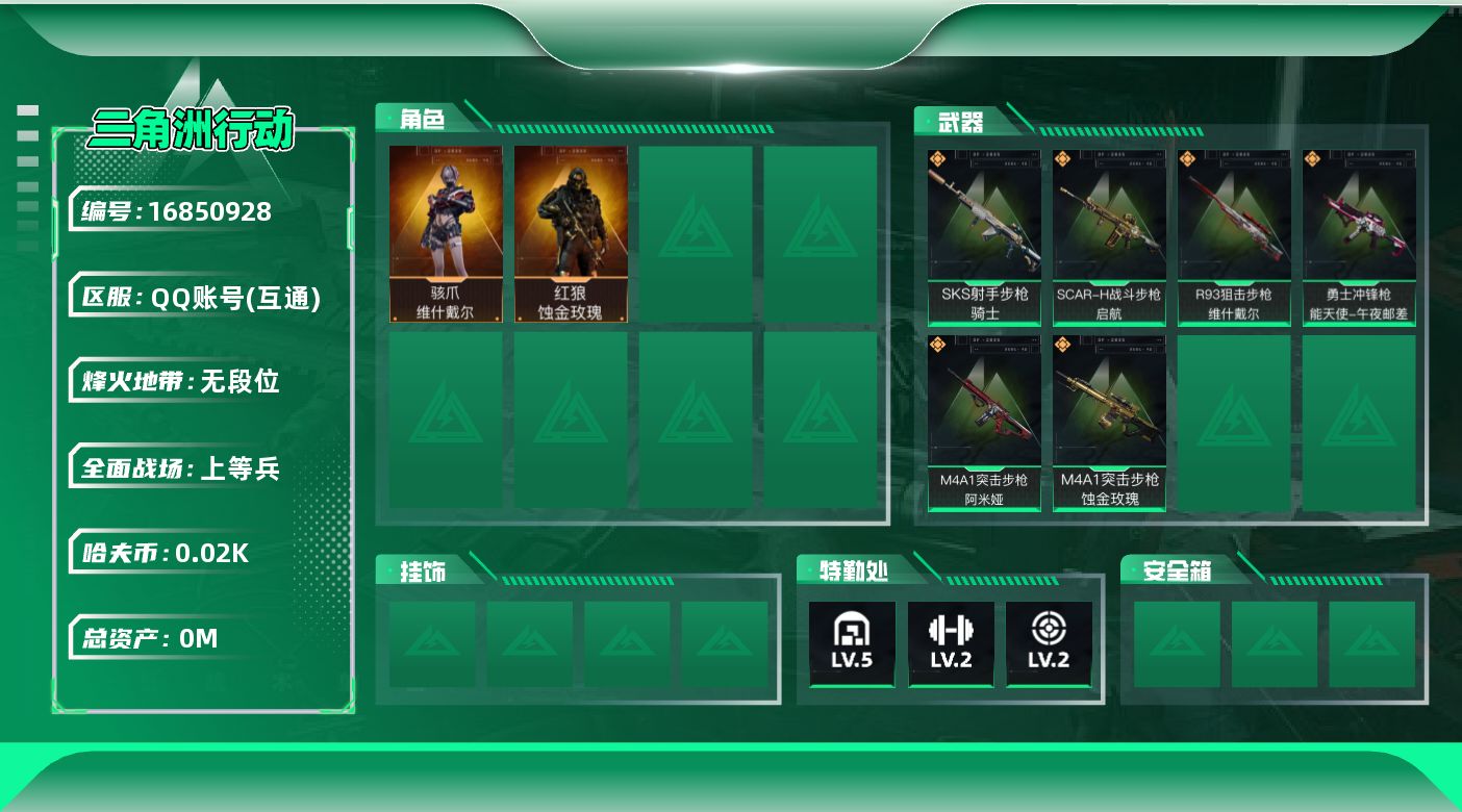 烽火段位钻石2 战场段位暂无段位 总资产168.1M 哈夫币38W 干员4 挂饰17 近战1 枪械220 载具28