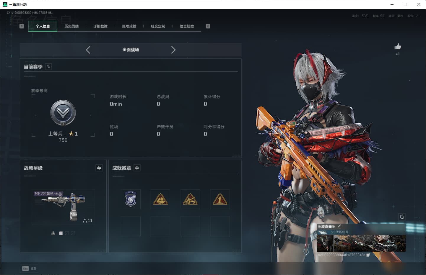 总资产(M):10M/哈夫币(K):75K/哈夫币(K):75K/全面战场等级:30_段位:上等兵/