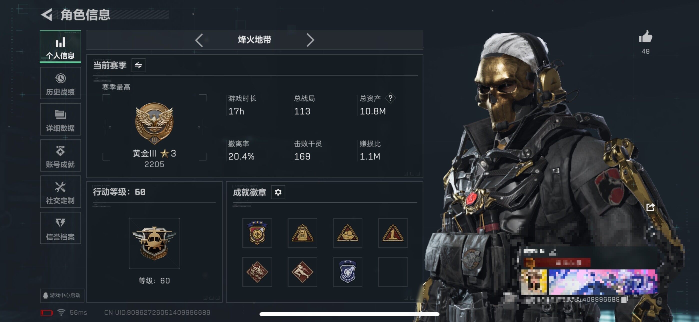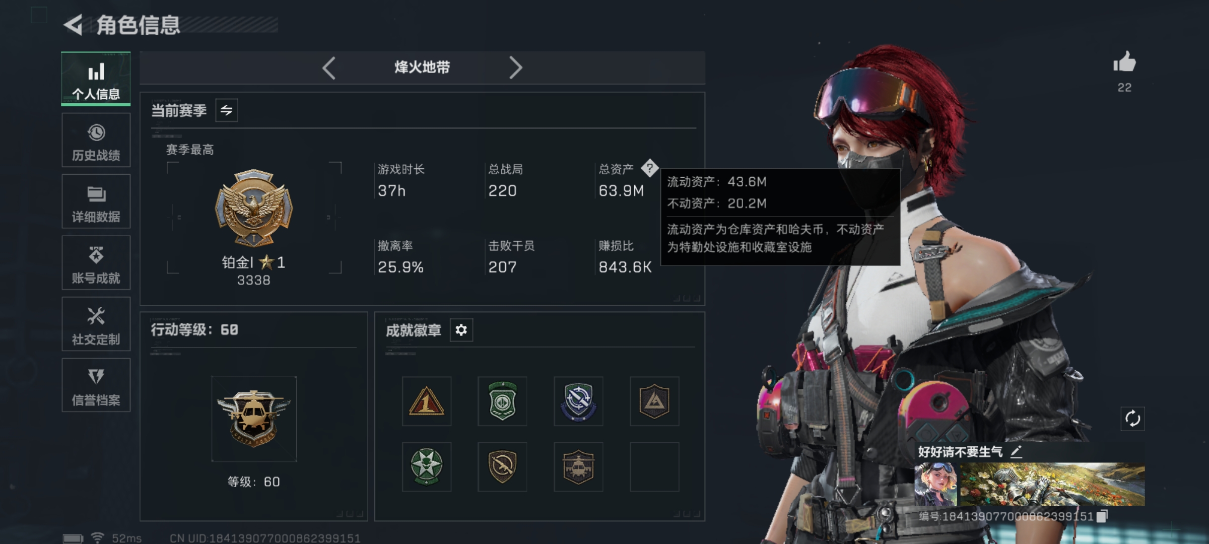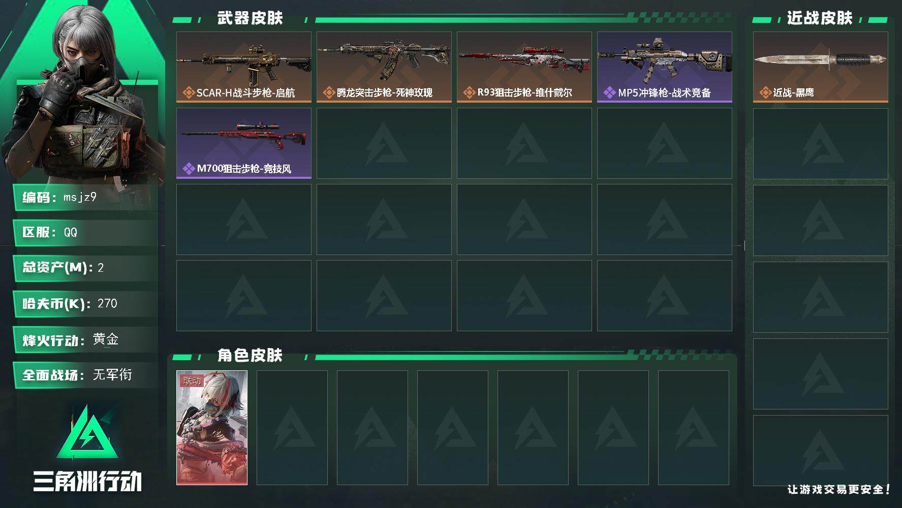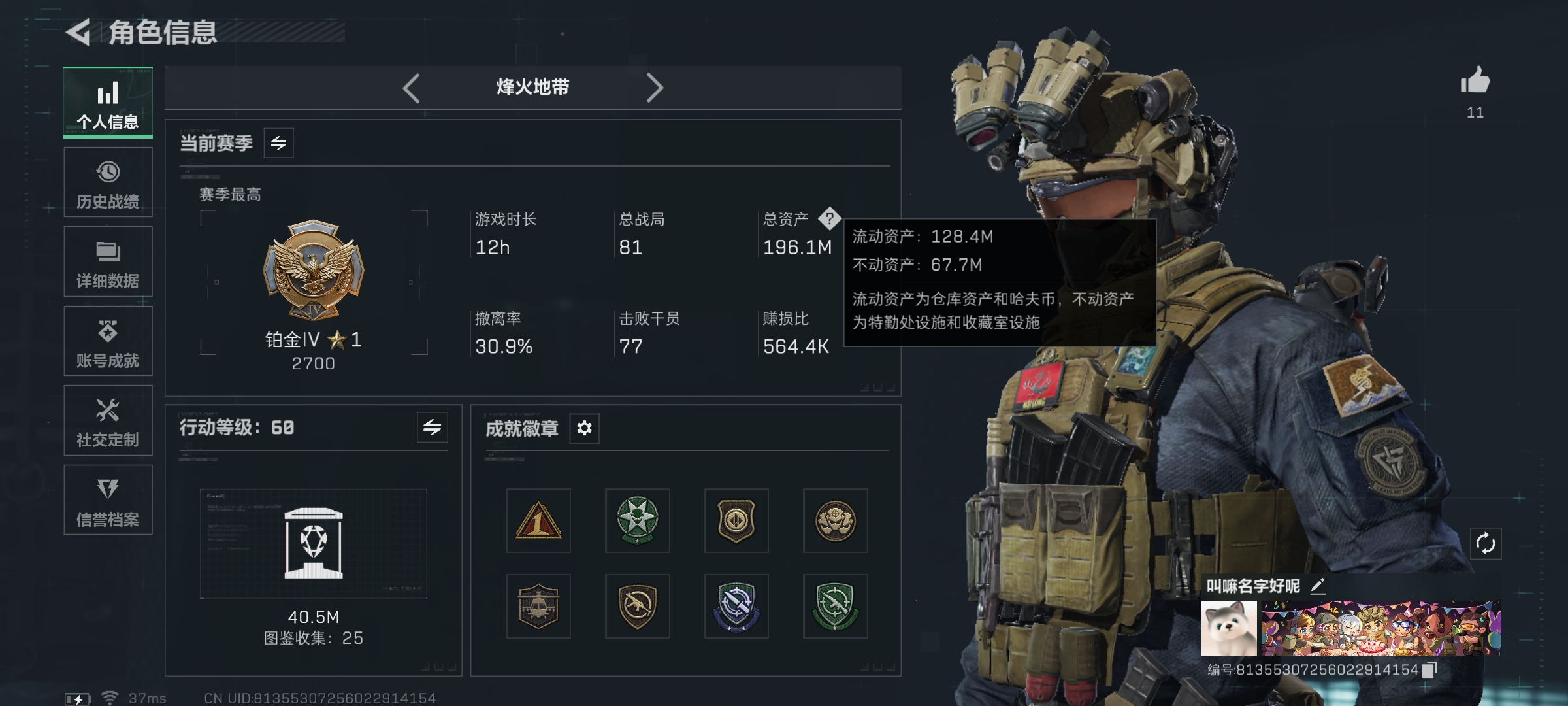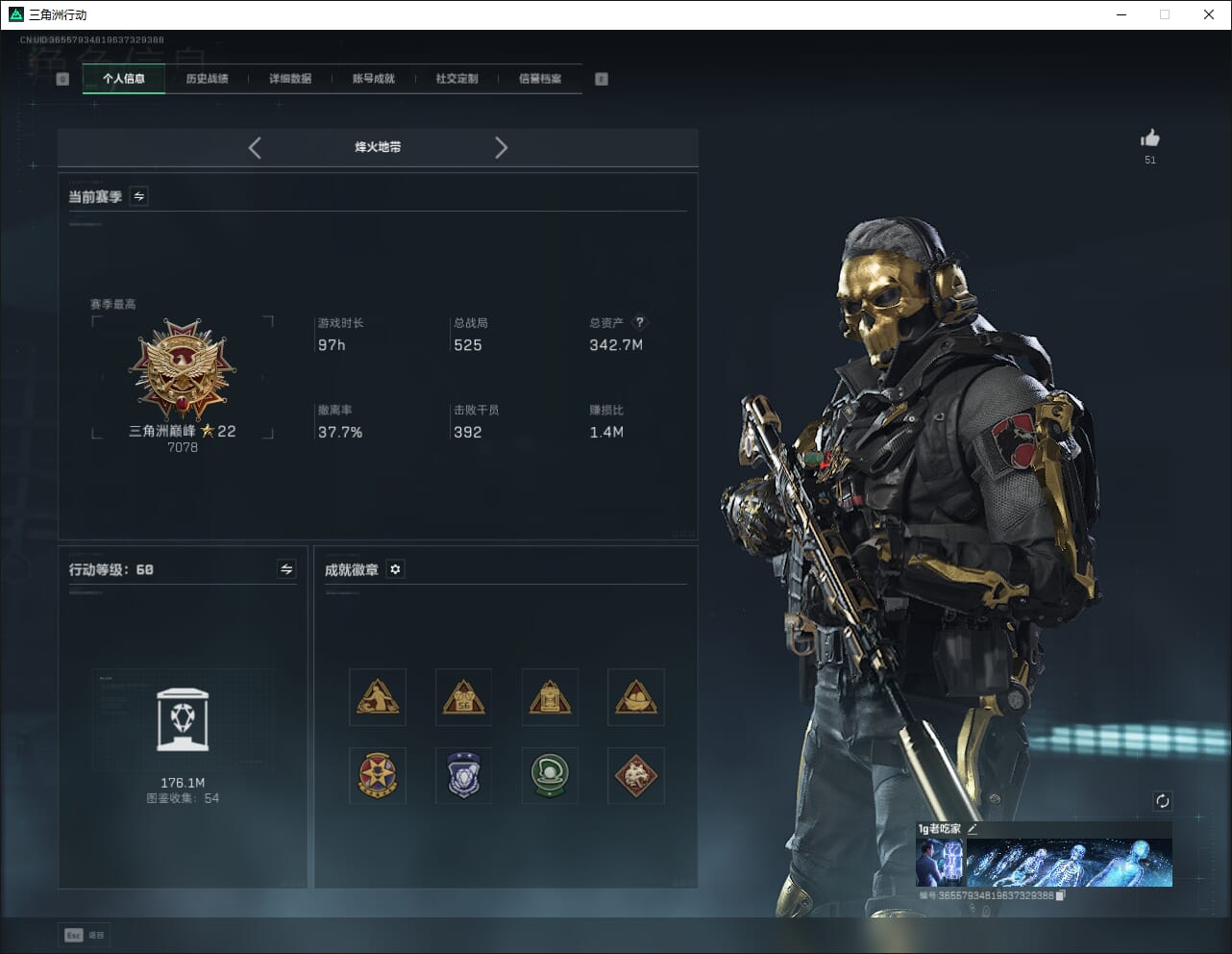 2m总资产-270k哈伏币-60烽火等级-黄金-1战场等级-无军衔【干员外观