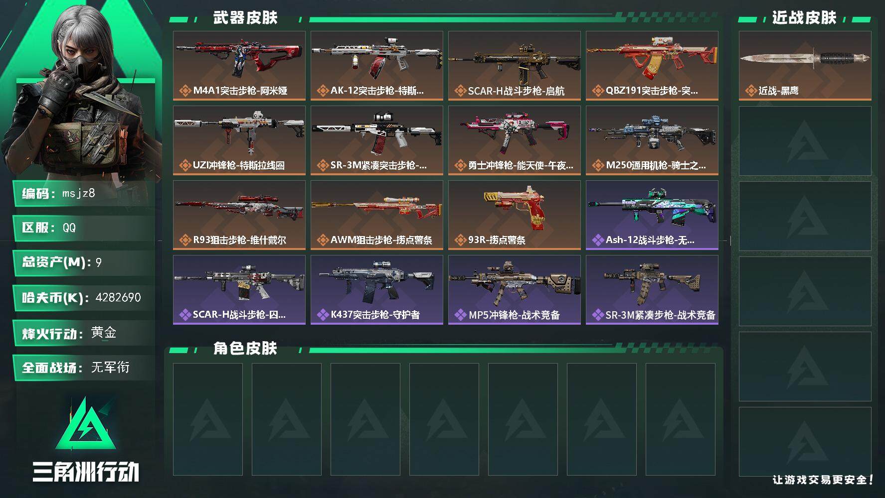 9m总资产-4282690k哈伏币-60烽火等级-黄金-1战场等级-无军衔【