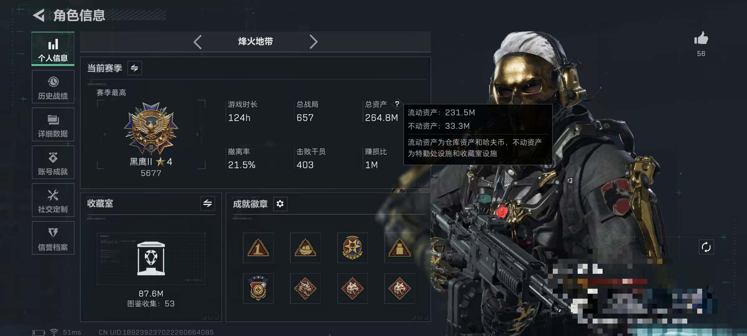 总资产(M):264M/哈夫币(K):469K/哈夫币(K):469K/全面战场等级:11_段位:列