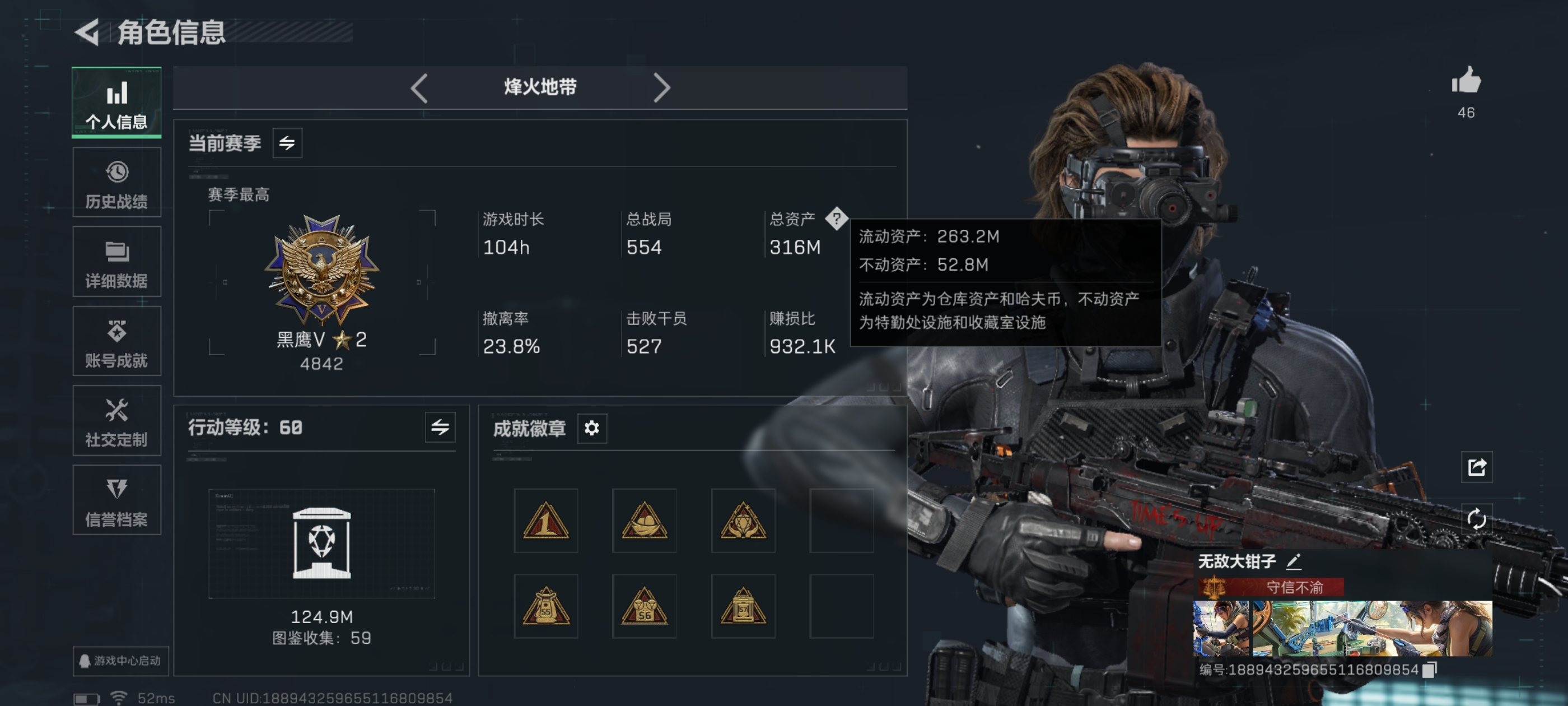总资产122.26M,哈夫币 52.74K,战场等级:17 列兵,行动等级:60 黑鹰,角色皮肤5,