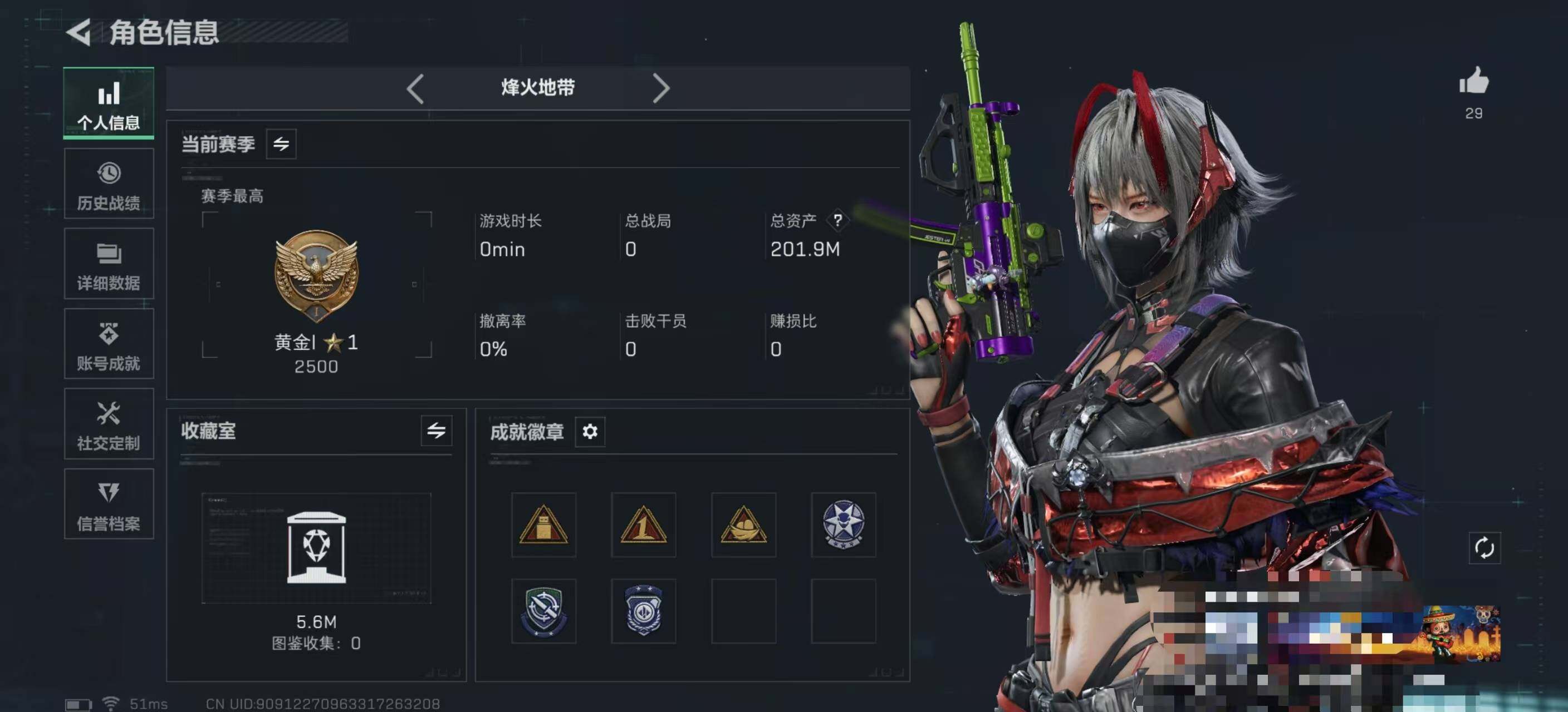 总资产(M):201M/哈夫币(K):125640K/哈夫币(K):125640K/全面战场等级:5