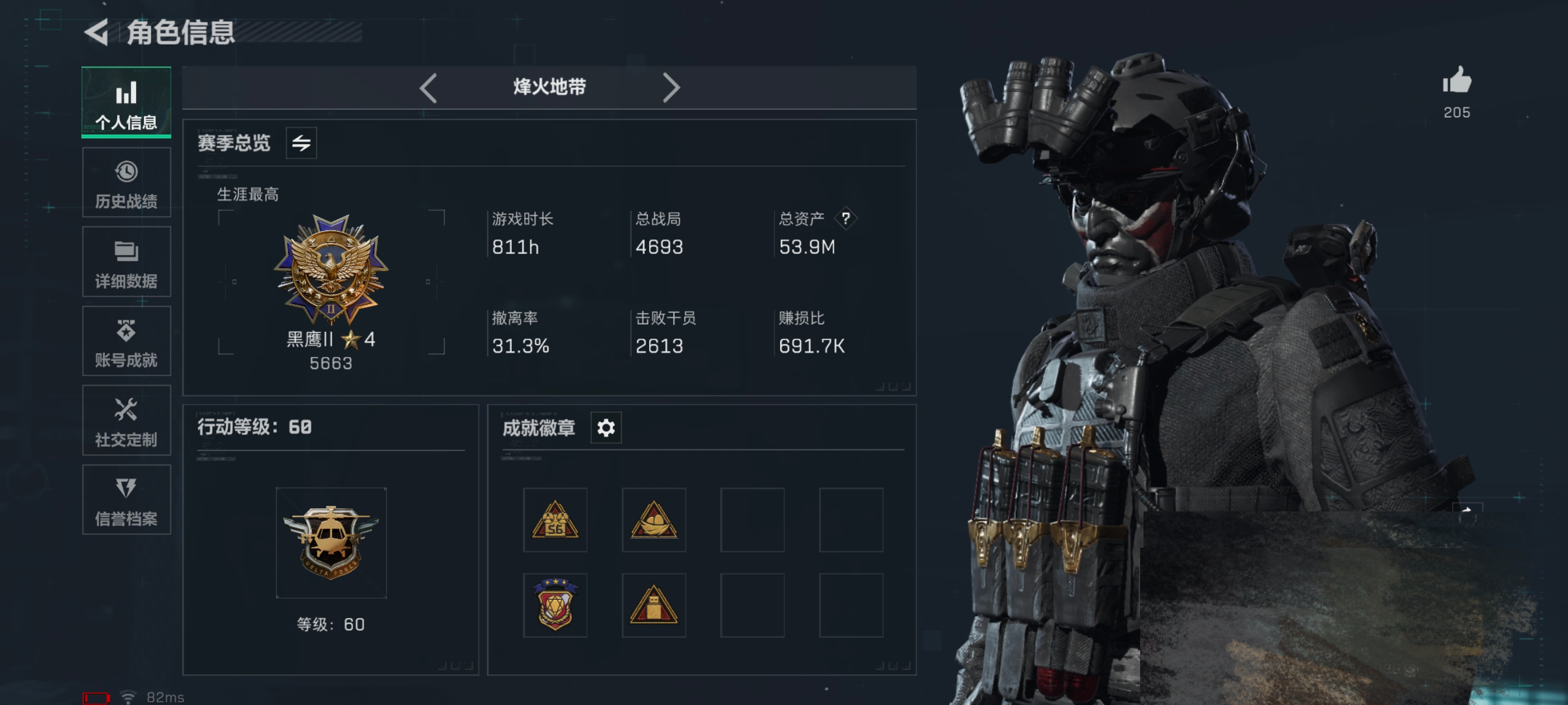 总资产(M):196M/哈夫币(K):2273K/全面战场等级:32_段位:上等兵/烽火地带等级:60_段位:钻石/