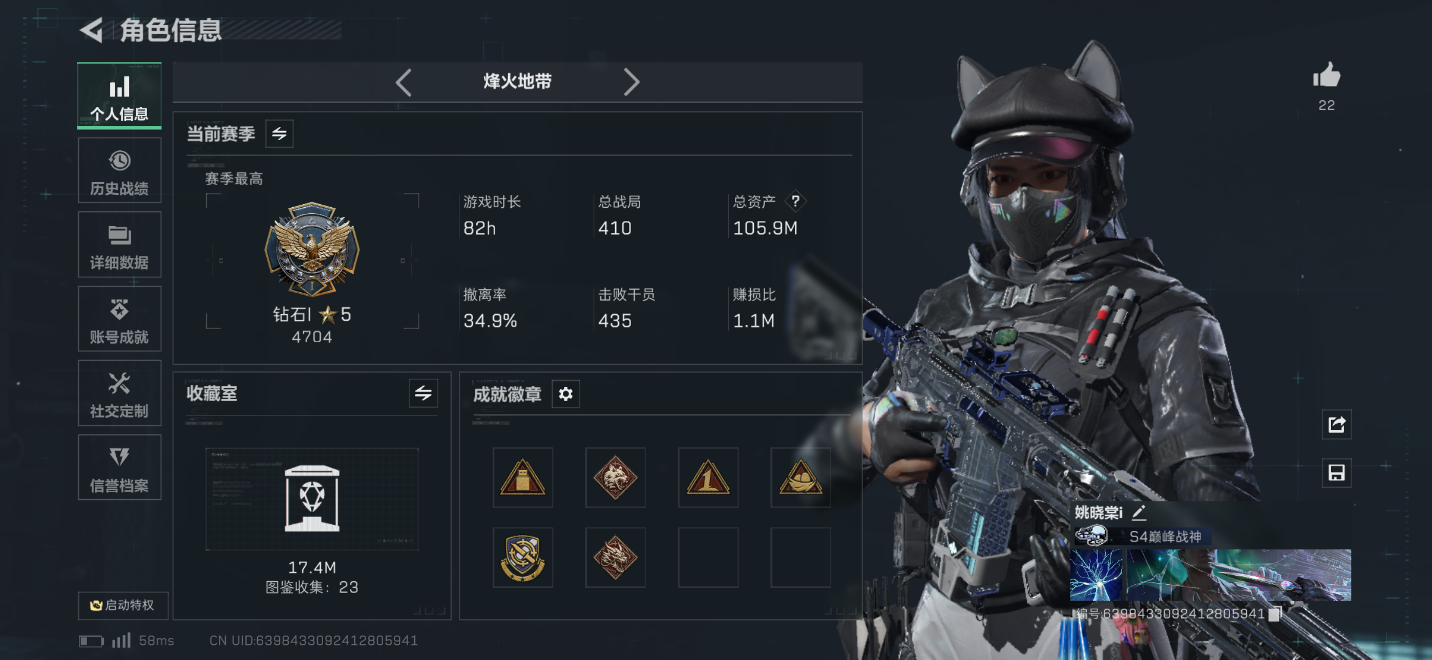 总资产(M):167M/哈夫币(K):1542K/ /全面战场等级:22_段位:上等兵/烽火地带等级:60_段位:钻石/