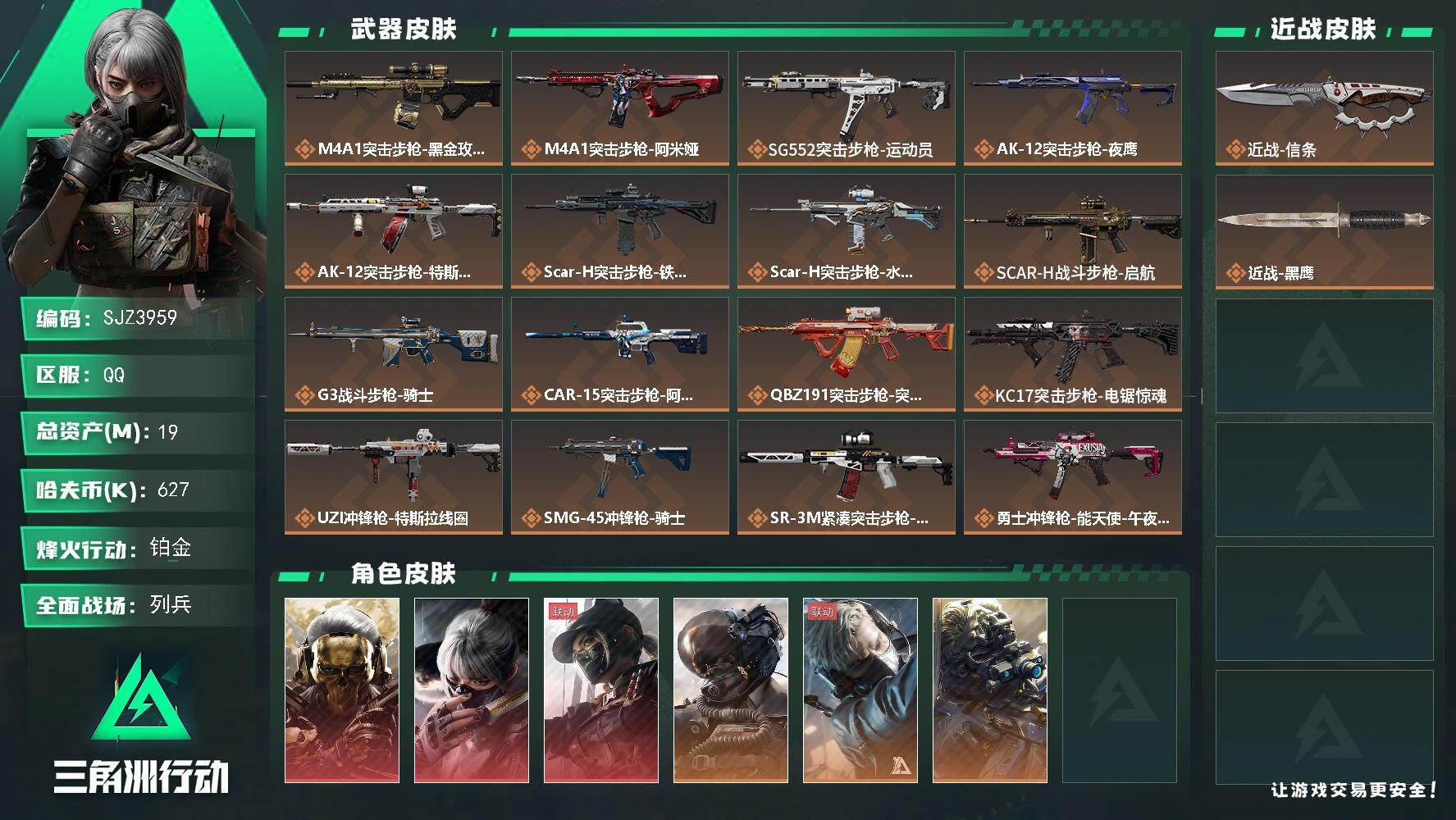 总资产(M):19M/哈夫币(K):627K/传说枪皮数:22/全面战场等级:16_段位:列兵/烽火地带等级:60_段位:铂金