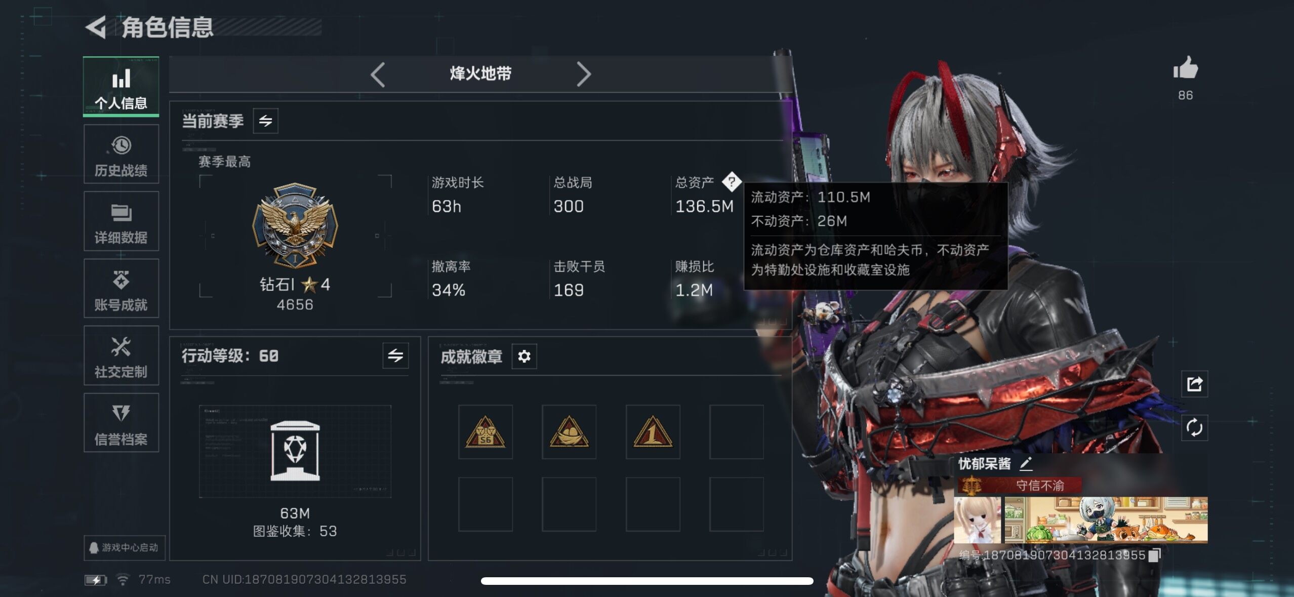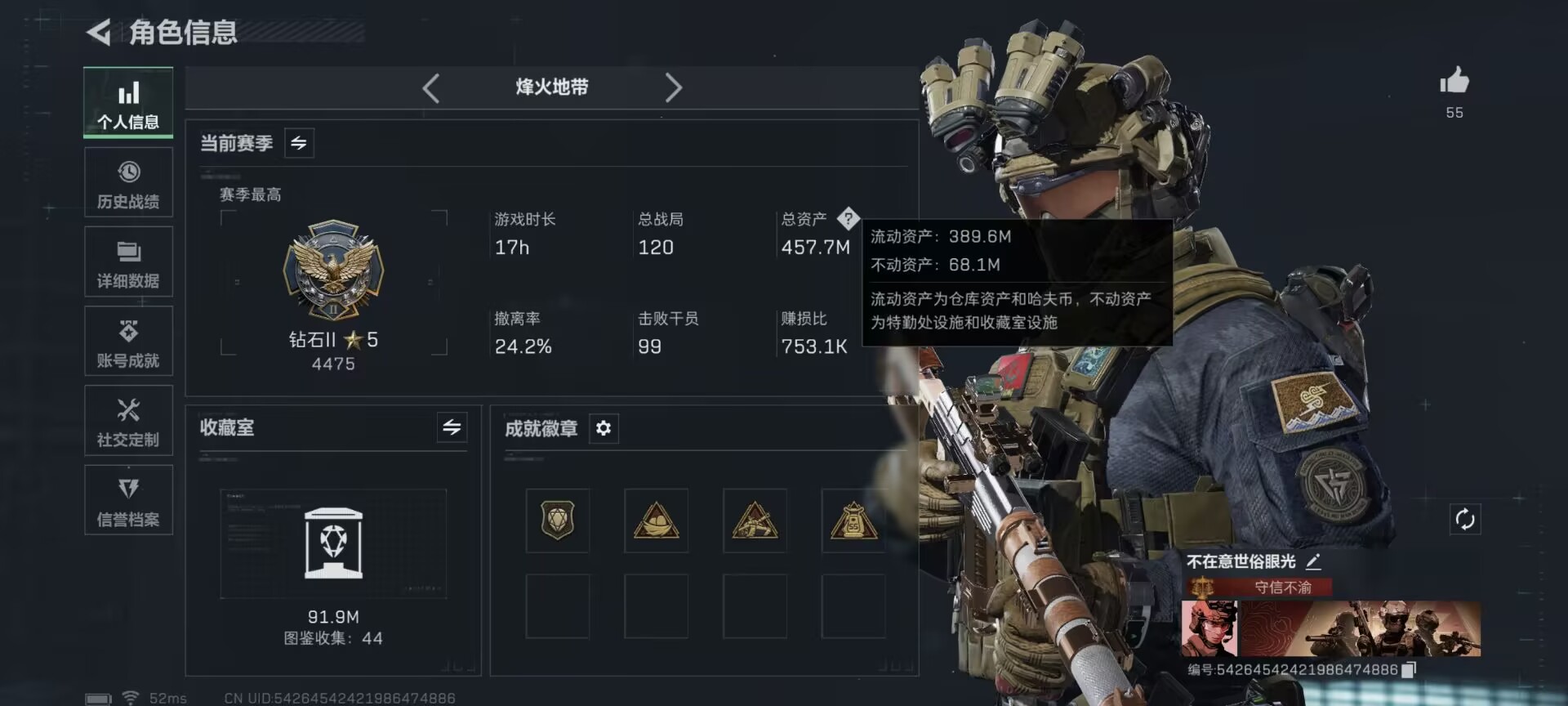 86m总资产-318k哈伏币-52烽火等级-黑鹰-1战场等级-无军衔【干员外
