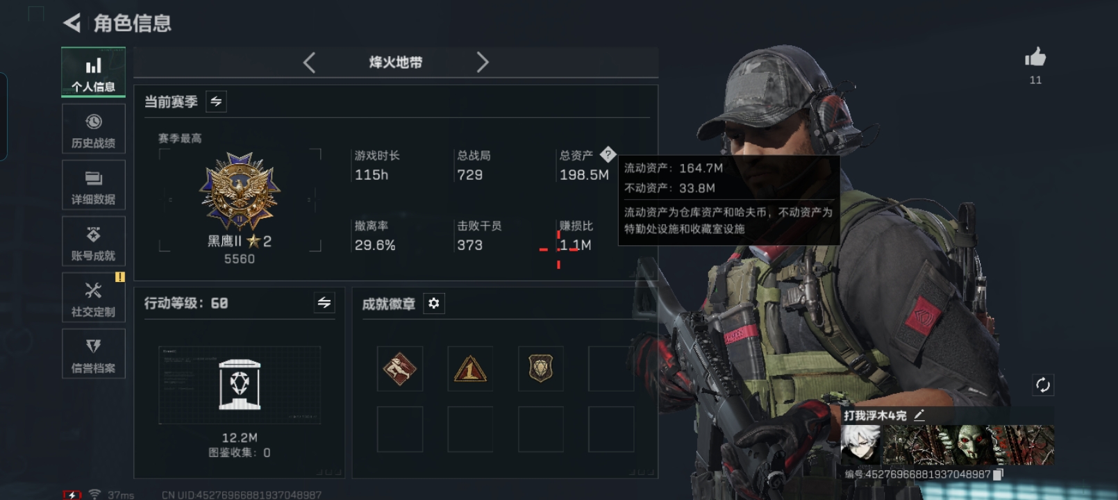 hssjz614 总资产186.9M,哈夫币 13288.48K,战场等级:22 列兵,行动等级:6