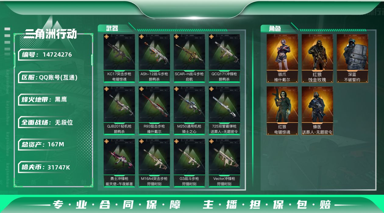 总资产167.9M/哈夫币31747k/赛季3*3,红狼-蚀金玫瑰,骇爪-维什戴尔,蜂医-送葬人·无