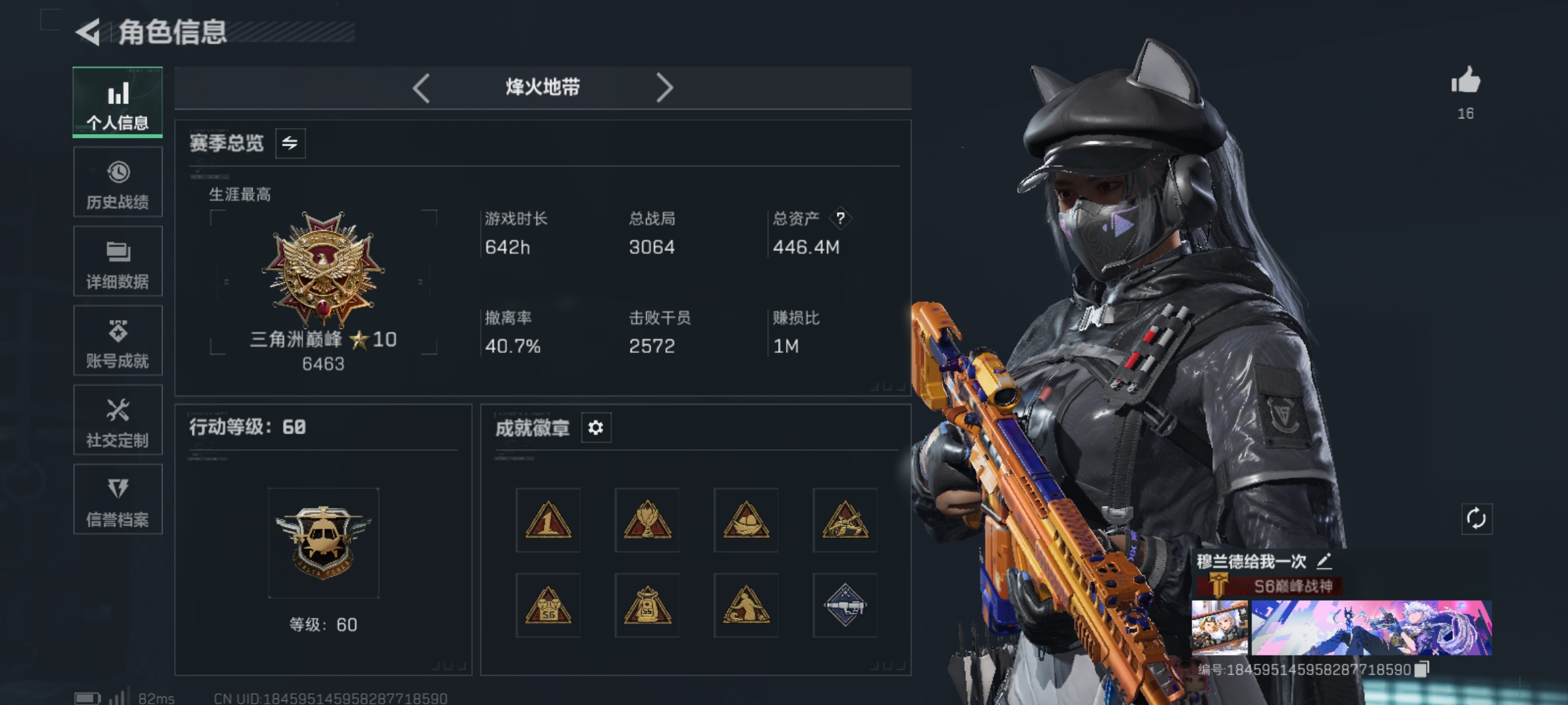 hssjz553 总资产186.69M,哈夫币 262.37K,战场等级:22 上等兵,行动等级:6