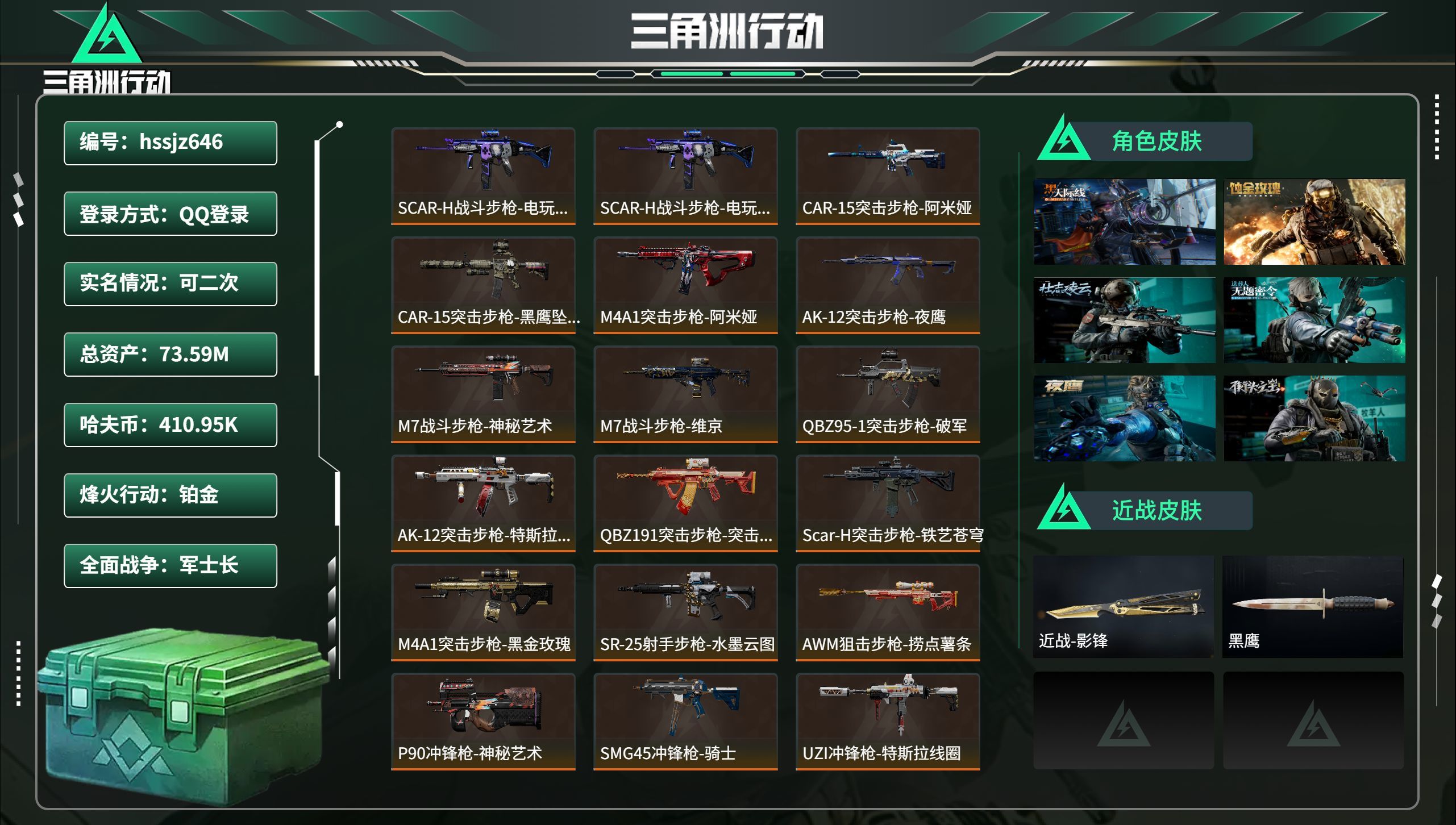 hssjz646 总资产73.59M,哈夫币 410.95K,战场等级:50 军士长,行动等级:60