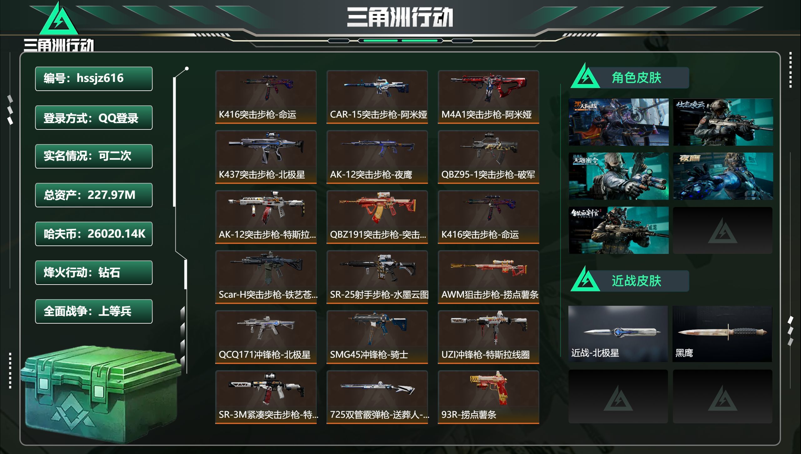 总资产227.97M,哈夫币 26020.14K,战场等级:50 上等兵,行动等级:60 钻石,角色