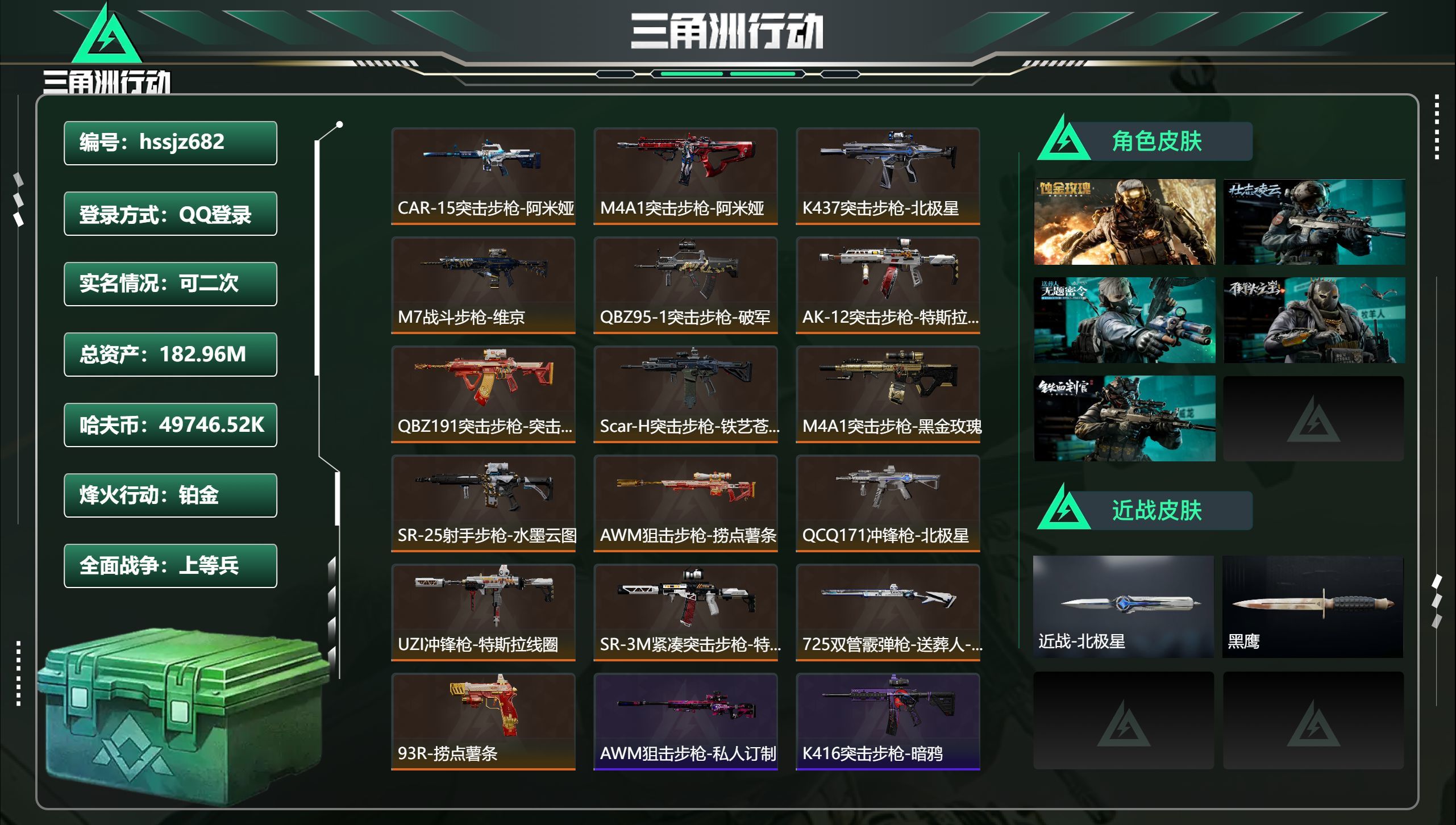总资产182.96M,哈夫币 49746.52K,战场等级:43 上等兵,行动等级:60 铂金,角色