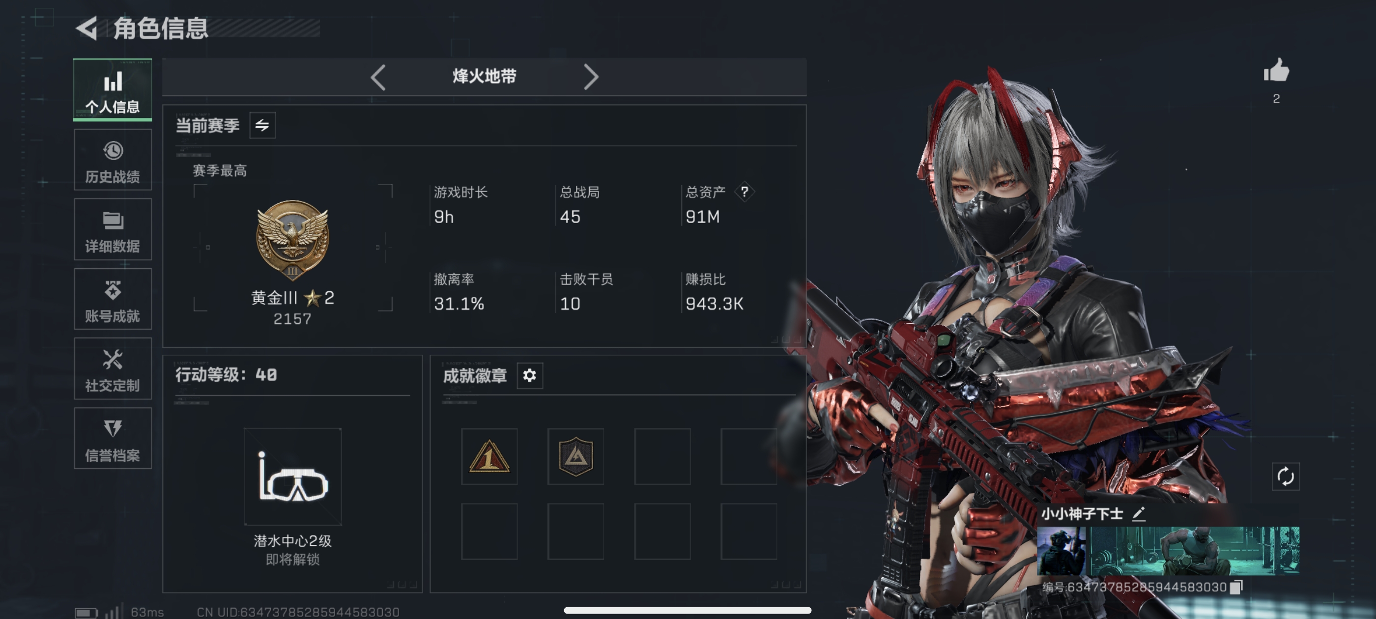 【SJ626】行动等级:60 总资产:85M 哈夫币:110.9W 近战武器: