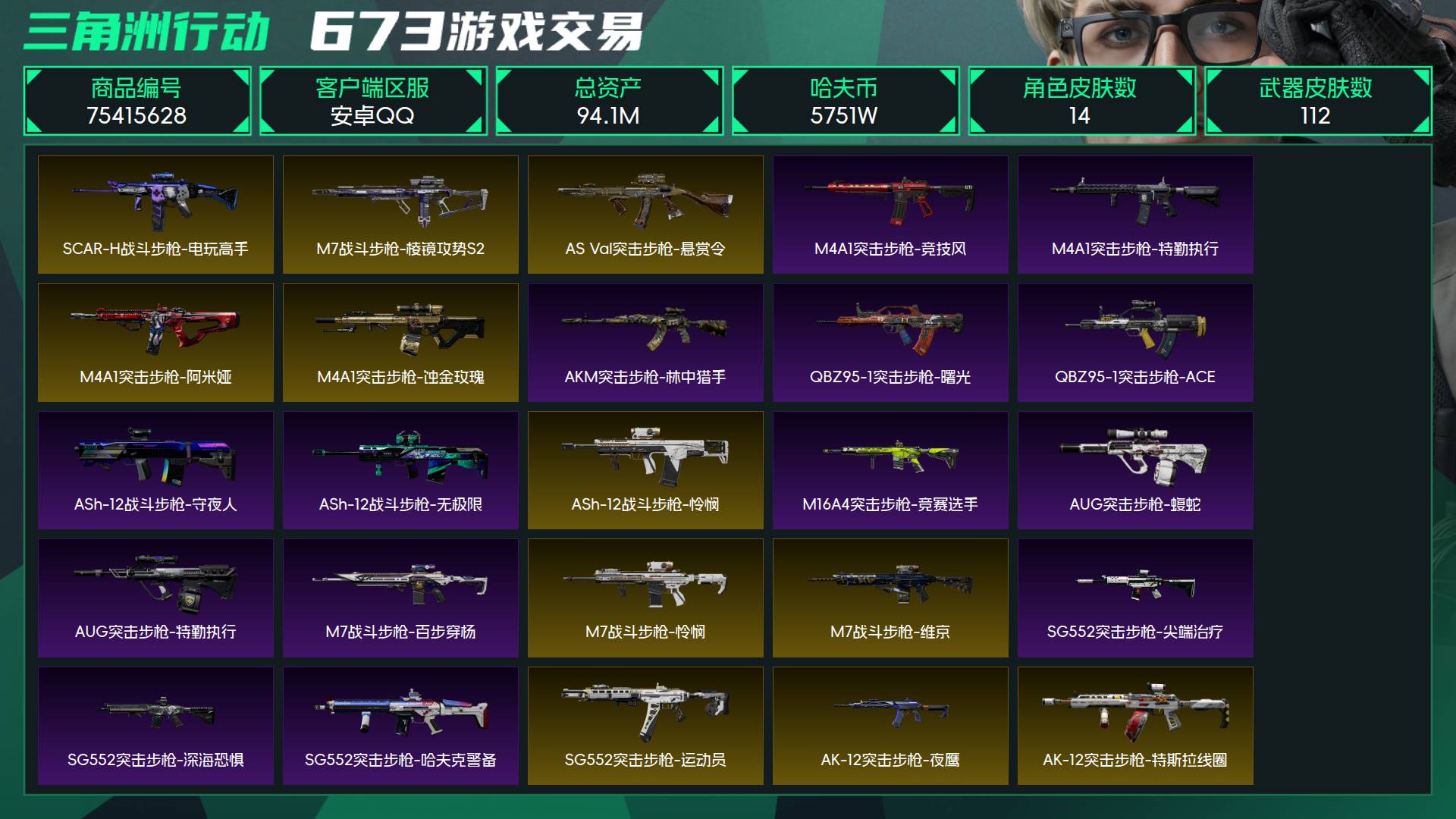 烽火段位三角洲巅峰 战场段位校官5 总资产94.1M 哈夫币5751W 干员14 挂饰27 近战3 枪械112 载具77