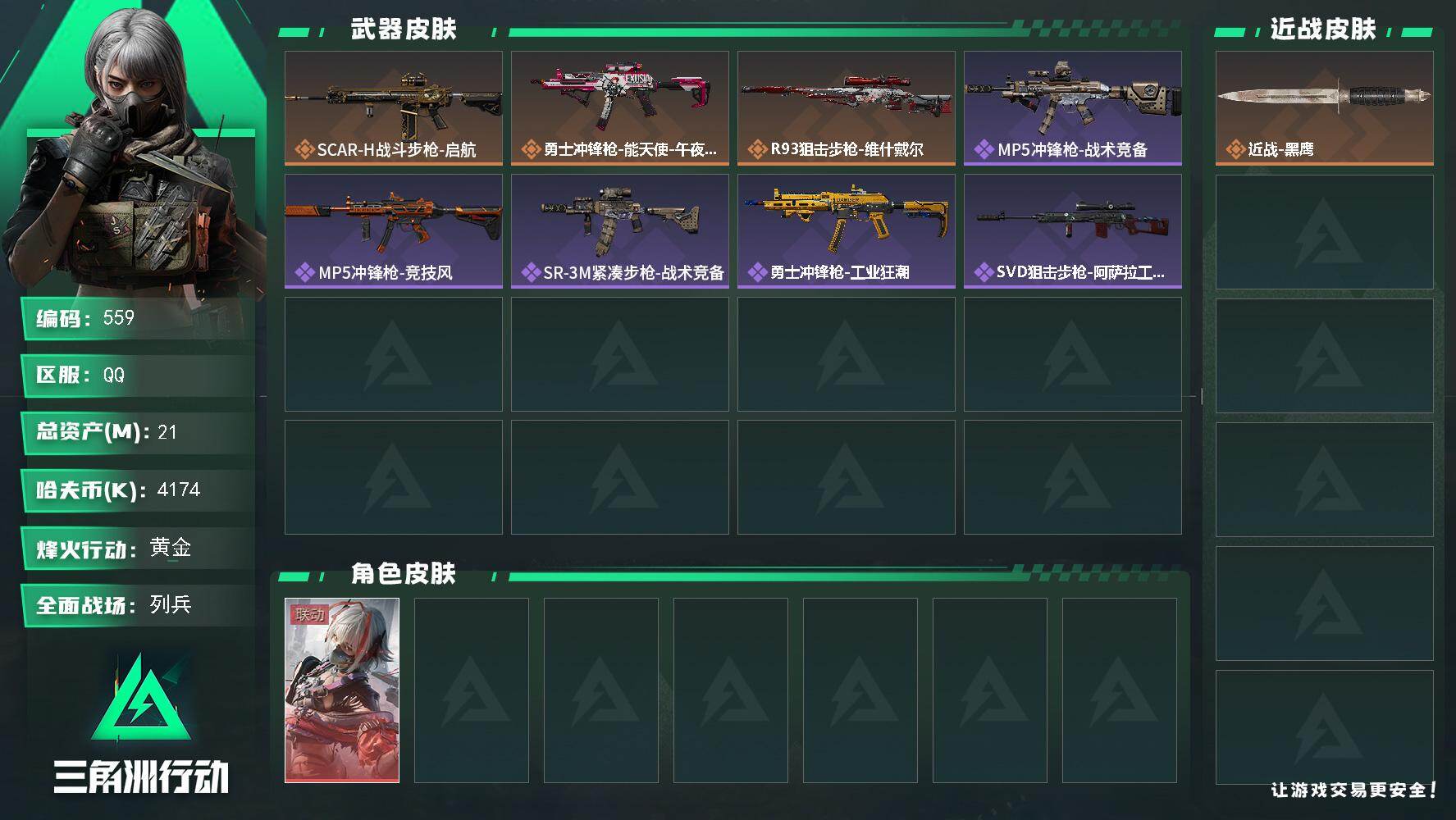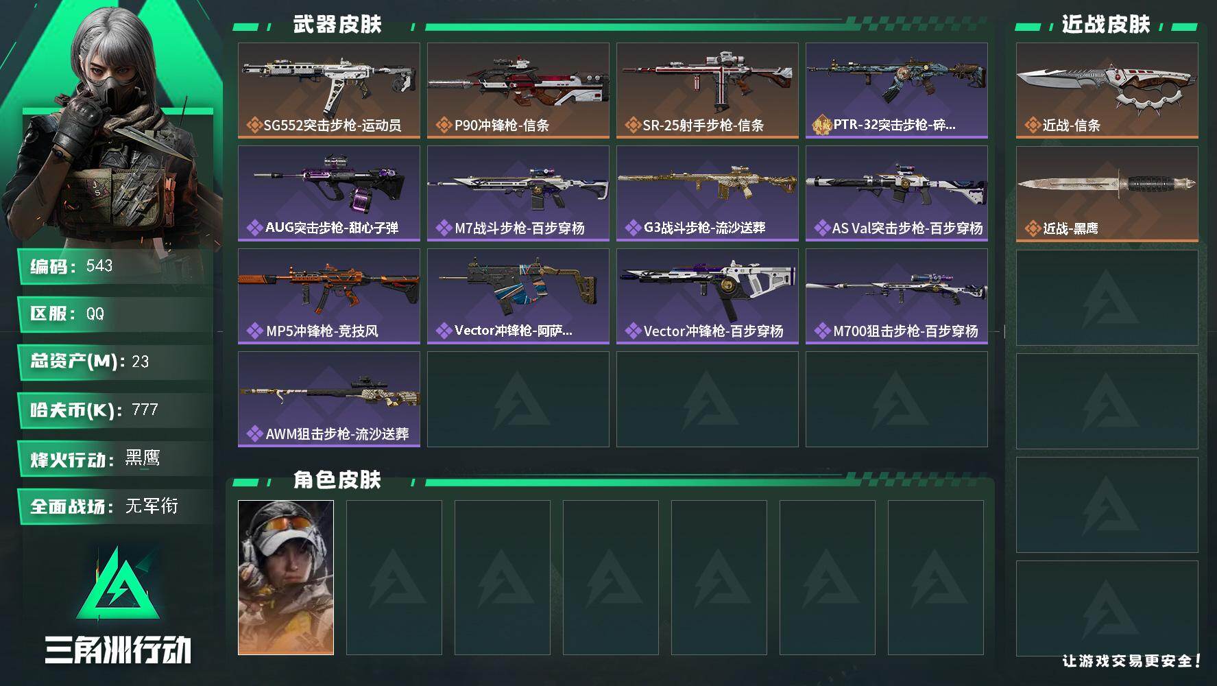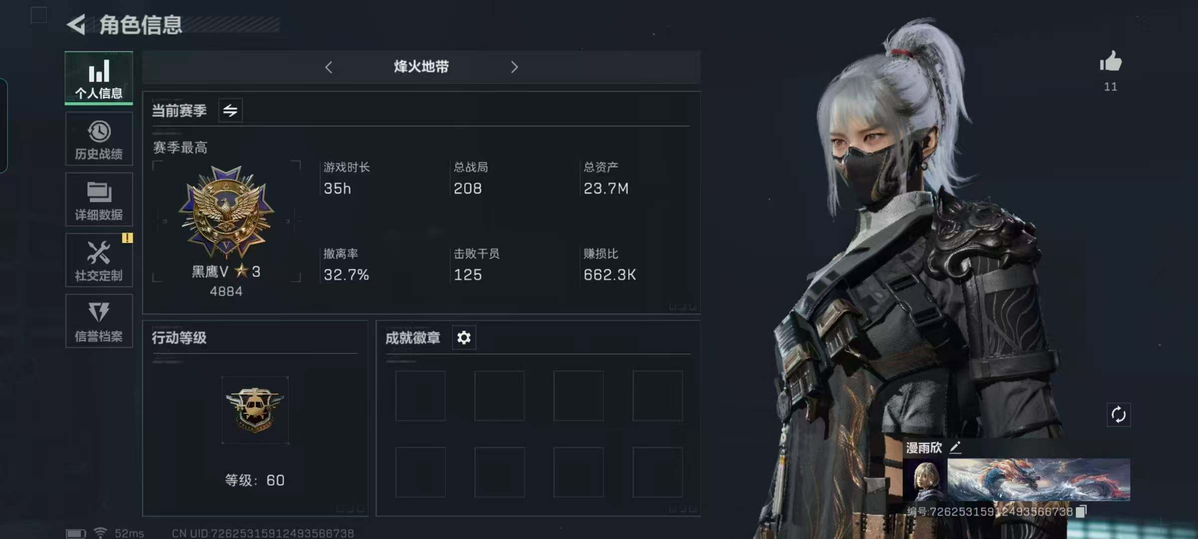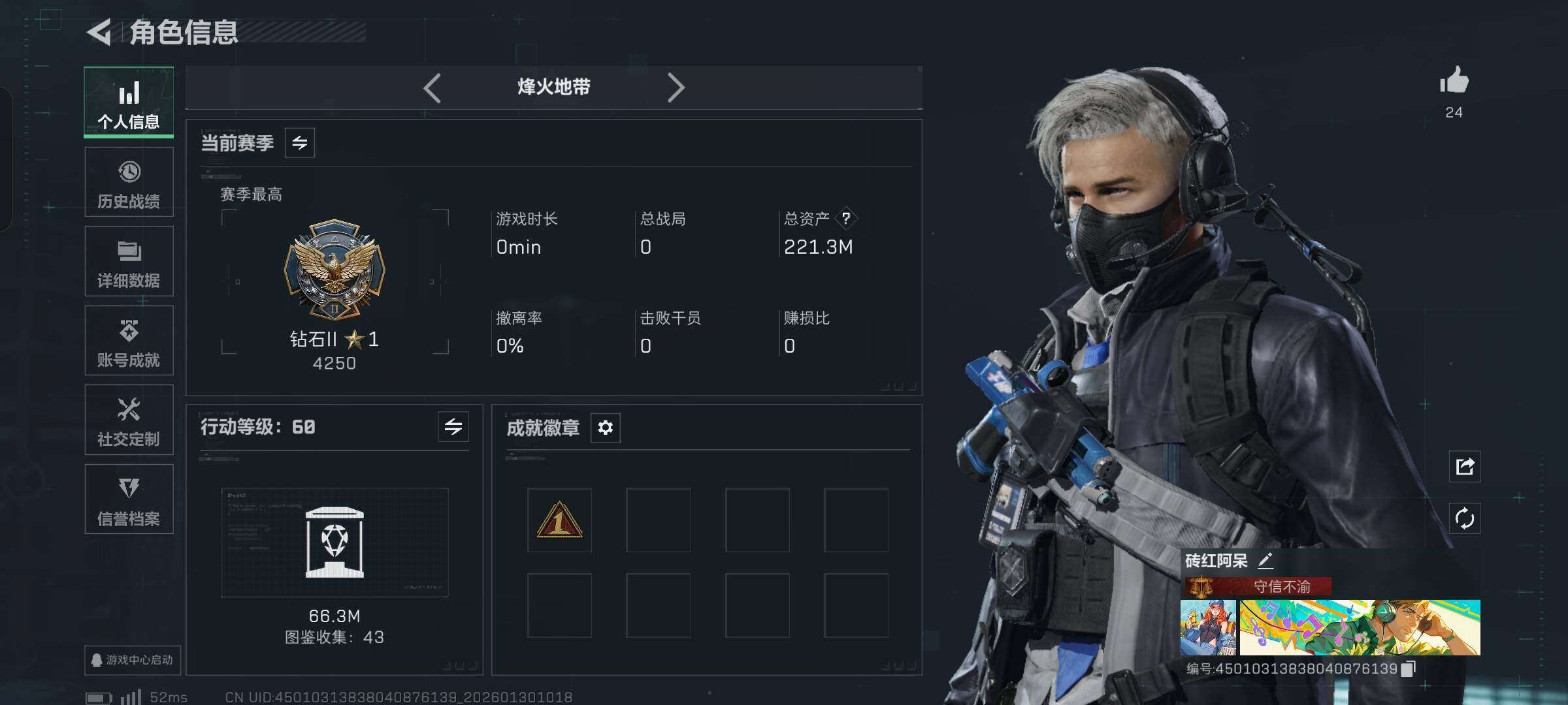 总资产(M):2M/哈夫币(K):118K/全面战场等级:23_段位:上等兵/烽火地带等级:53_段位:钻石/