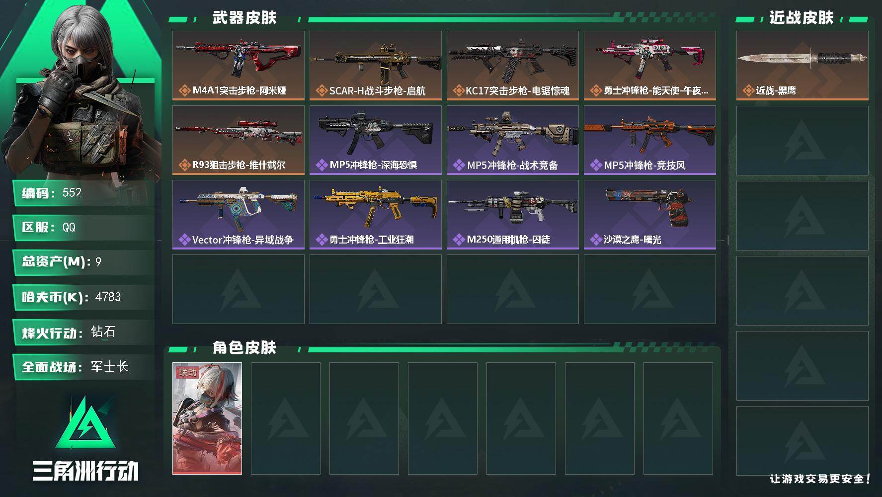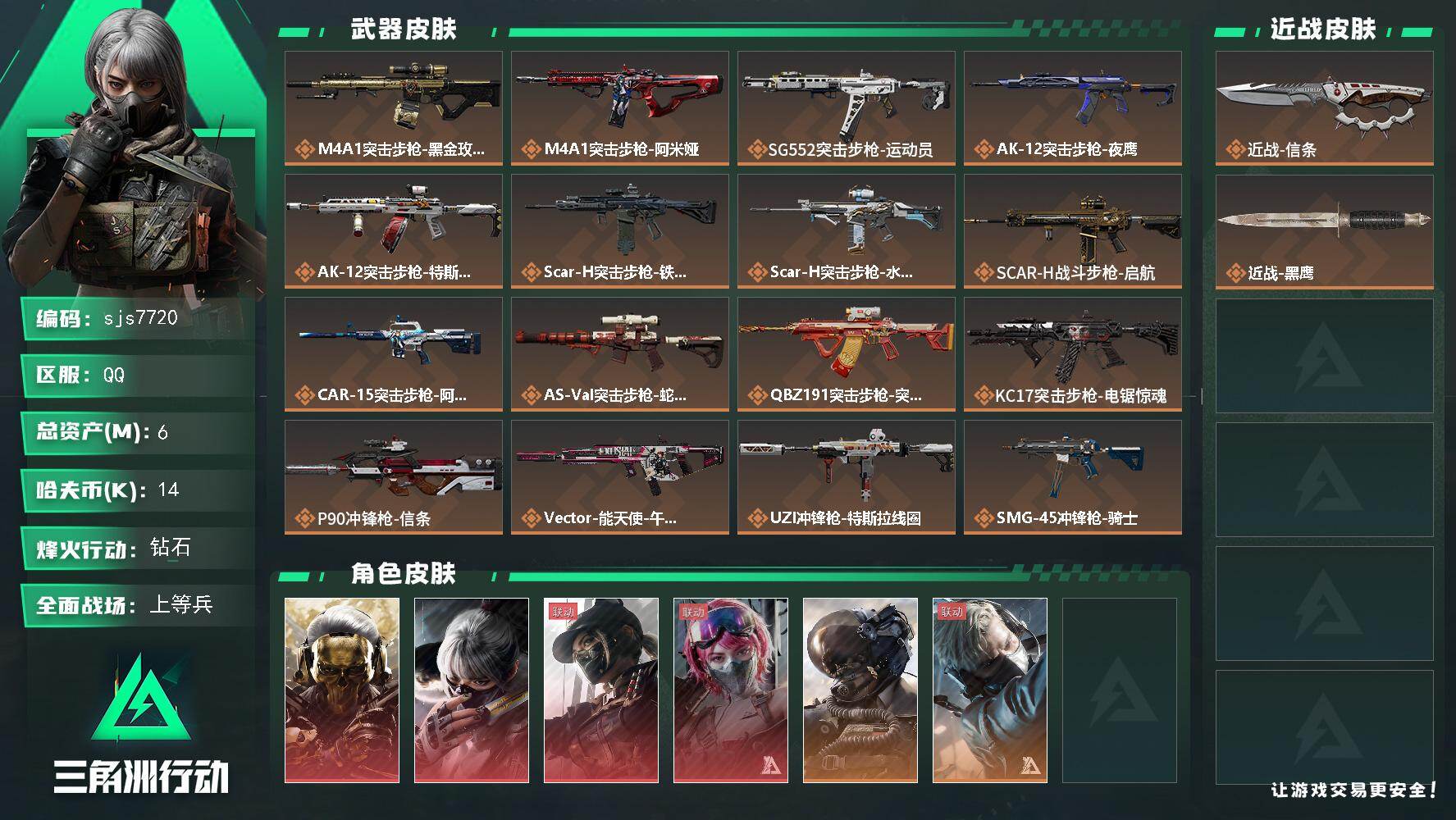 总资产6m 红狼 露娜 水墨 午夜邮差 信条 烽火地带段位: 钻石 全面战场段位: 上等兵 总资产: 6000000 哈夫币: 14000