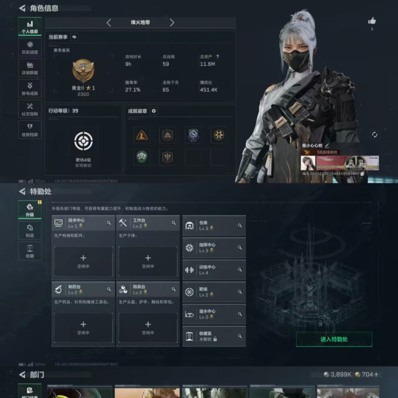 q区可2 腾龙气象感应雷粉色优品c qbz王牌之剑优品b 58发awm子弹 5个高级咖啡豆 3x3已做 总资产280m现金171m 满级体力 6级靶场 7级仓库 5级指挥中心