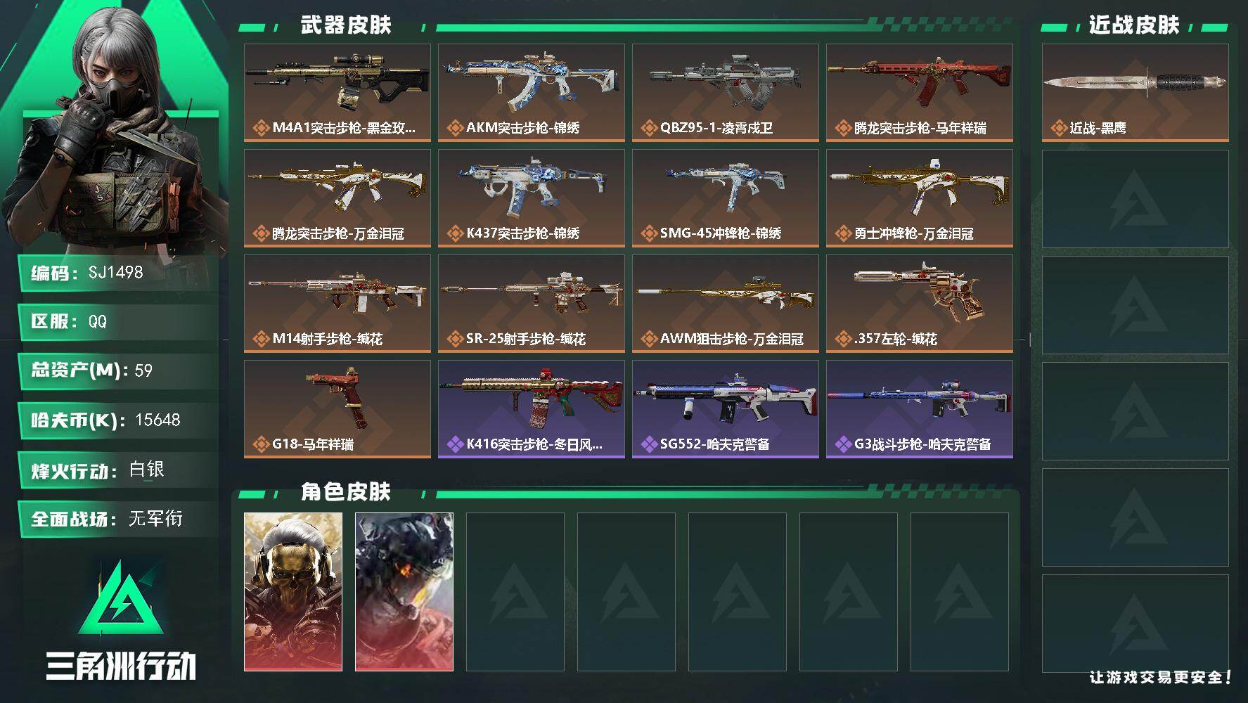 85m总资产-21083k哈夫币-60烽火等级-黑鹰-25战场等级-军士长【