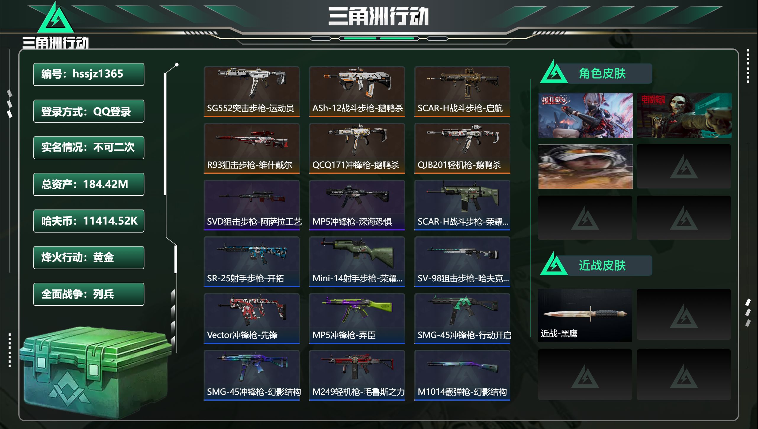 总资产184.42M,哈夫币 11414.52K,战场等级:1 列兵,行动等级