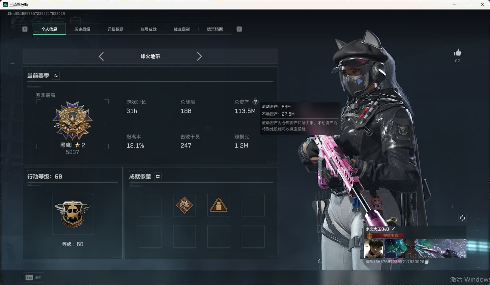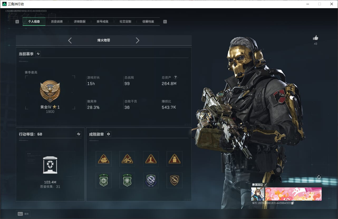 总资产(M):37M/哈夫币(K):3567K/全面战场等级:1_段位:无段位/烽火地带等级:60_段位:黄金/