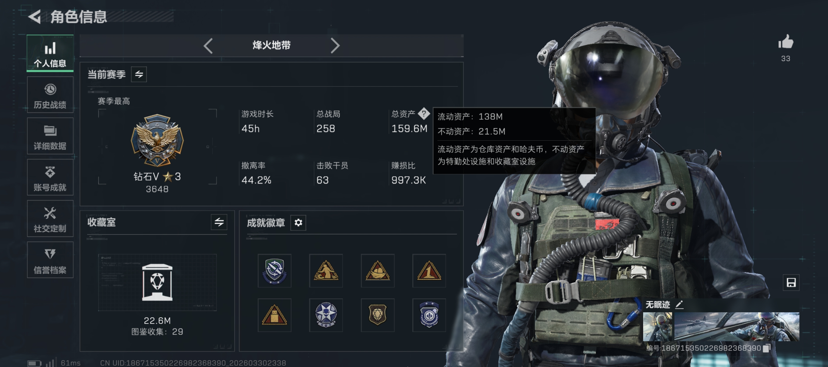 109m总资产-1413k哈夫币-60烽火等级-白银-22战场等级-军士长【