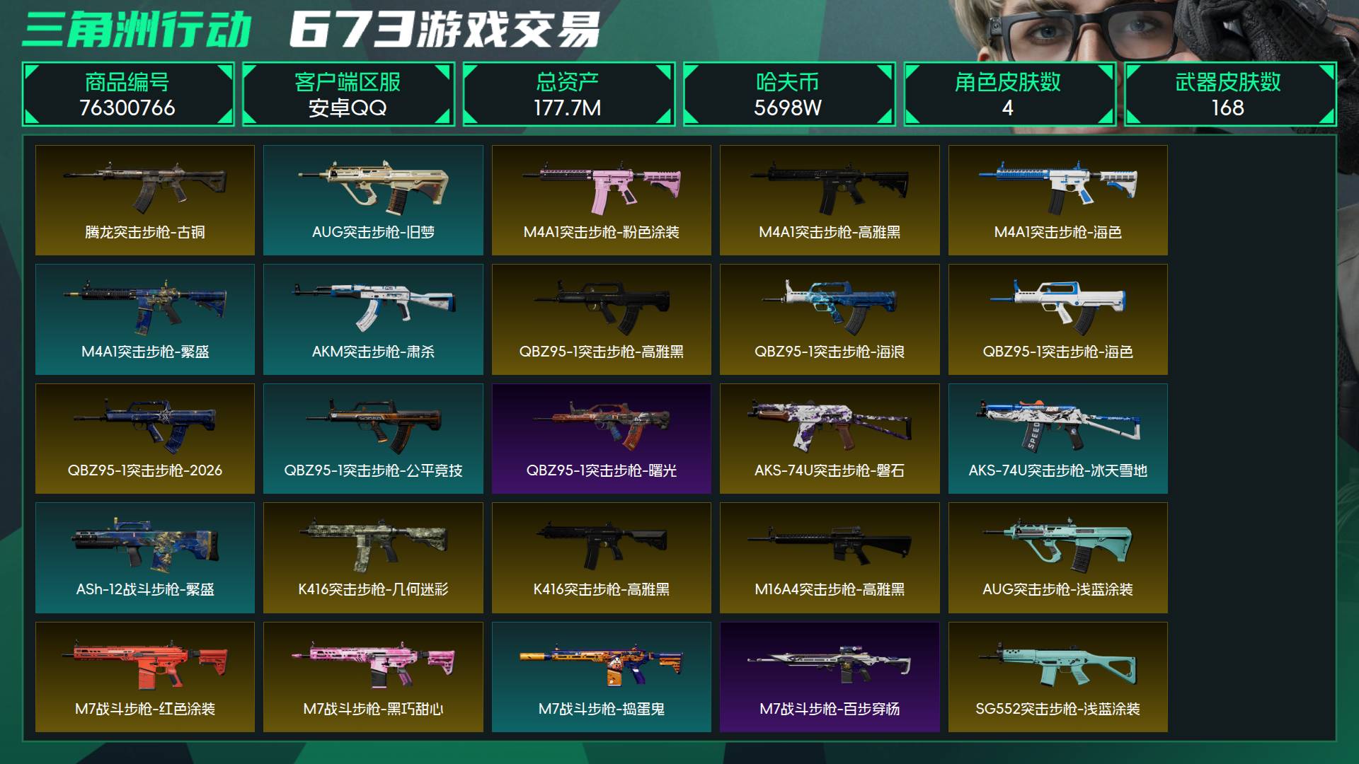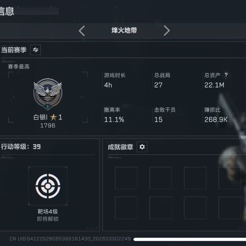 烽火段位钻石4 战场段位军士长2 总资产177.7M 哈夫币5698W 干员4 挂饰19 近战3 枪