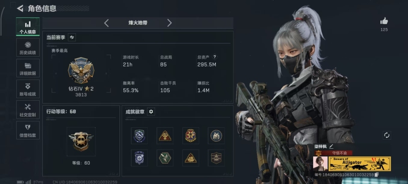 SSXH8755/区服QQ/哈夫币50万/总资产53.3M/行动等级60/战场等级1/【近战】/信条