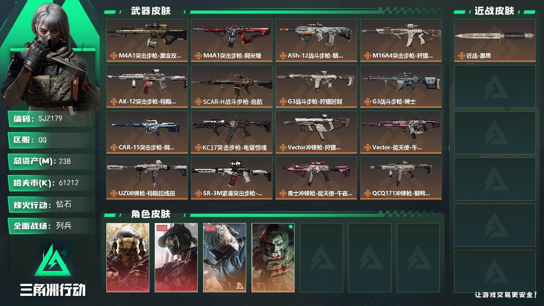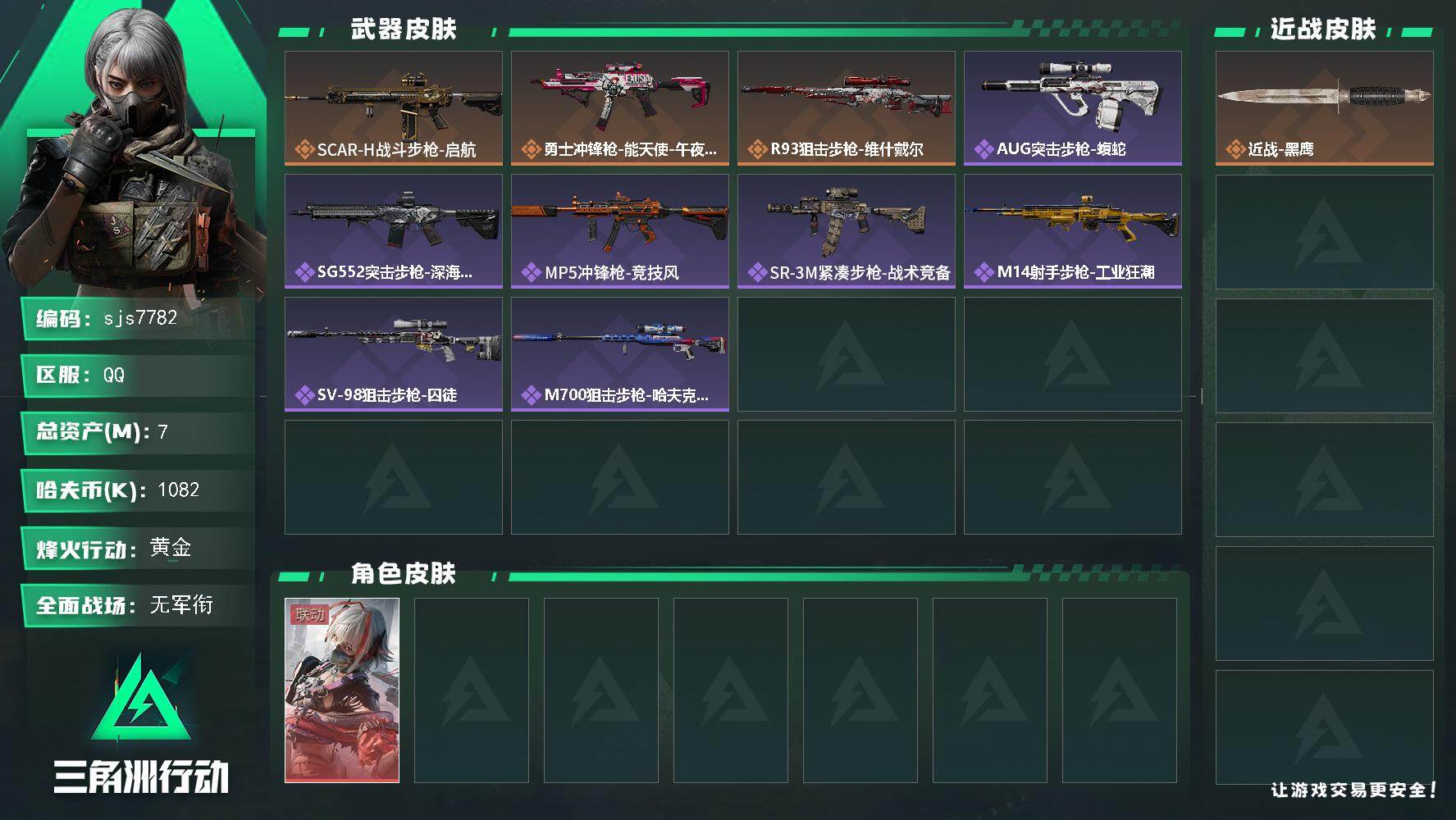 60级成品号 单维什戴尔 可二次 体力负重双4 三角洲无处罚记录纯绿 烽火地带段位: 黄金 全面战场段位: 无段位 总资产: 7000000 哈夫币: 1082000