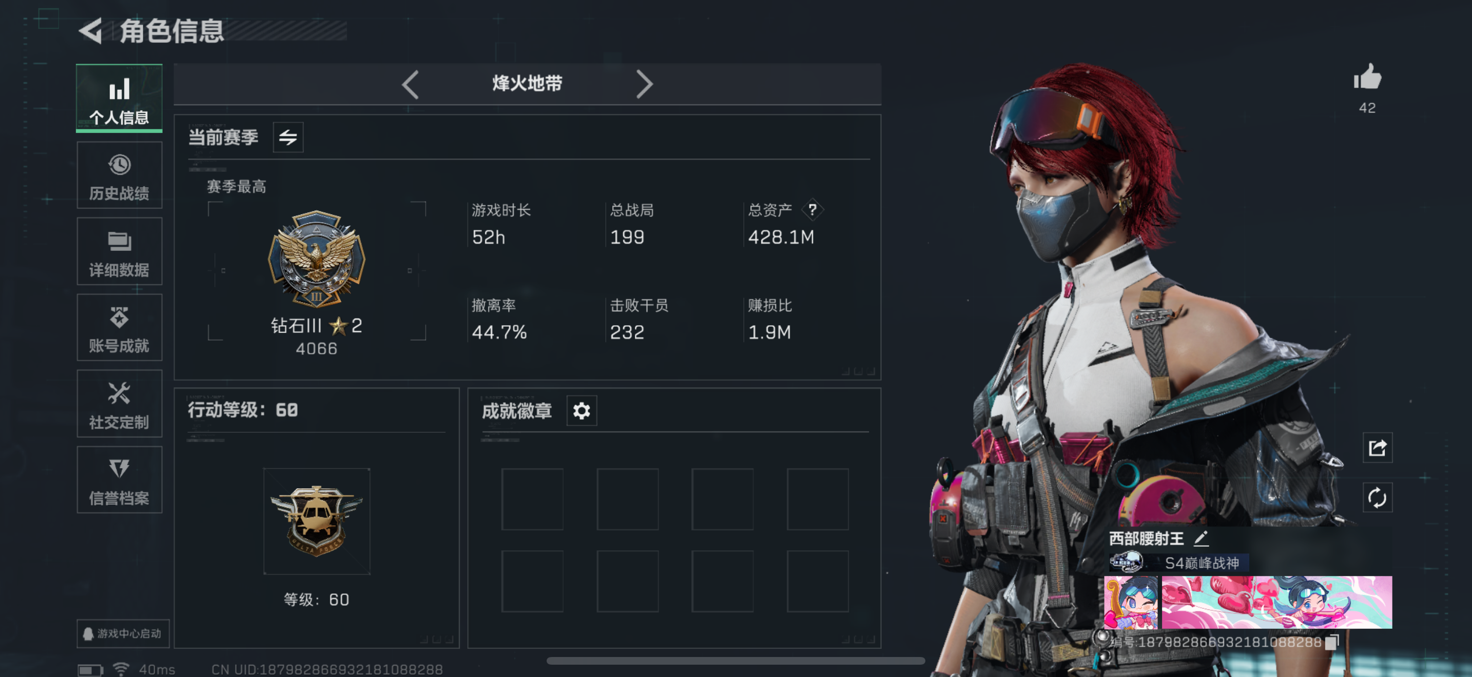 总资产79.82M,哈夫币 312.15K,战场等级:10 列兵,行动等级:60 钻石,角色皮肤9,