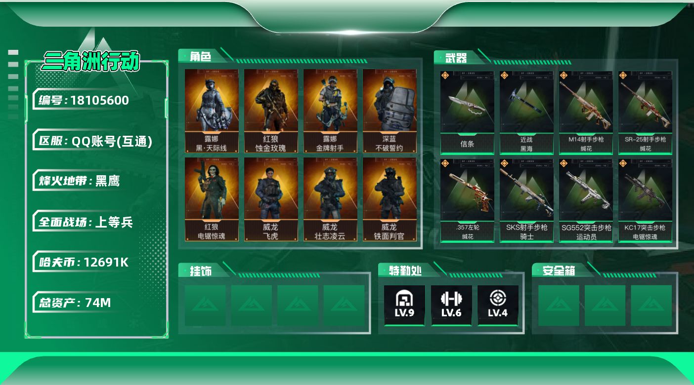 74m总资产-12691k哈夫币-60烽火等级-黑鹰-50战场等级-上等兵