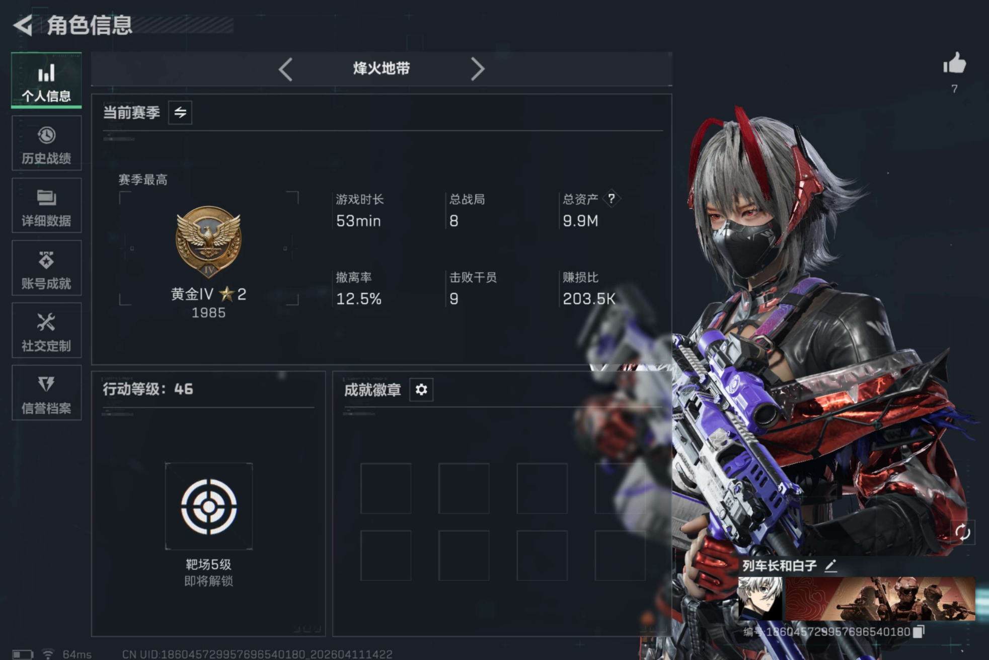 44m总资产-229k哈夫币-60烽火等级-黑鹰-1战场等级-无军衔【干员外