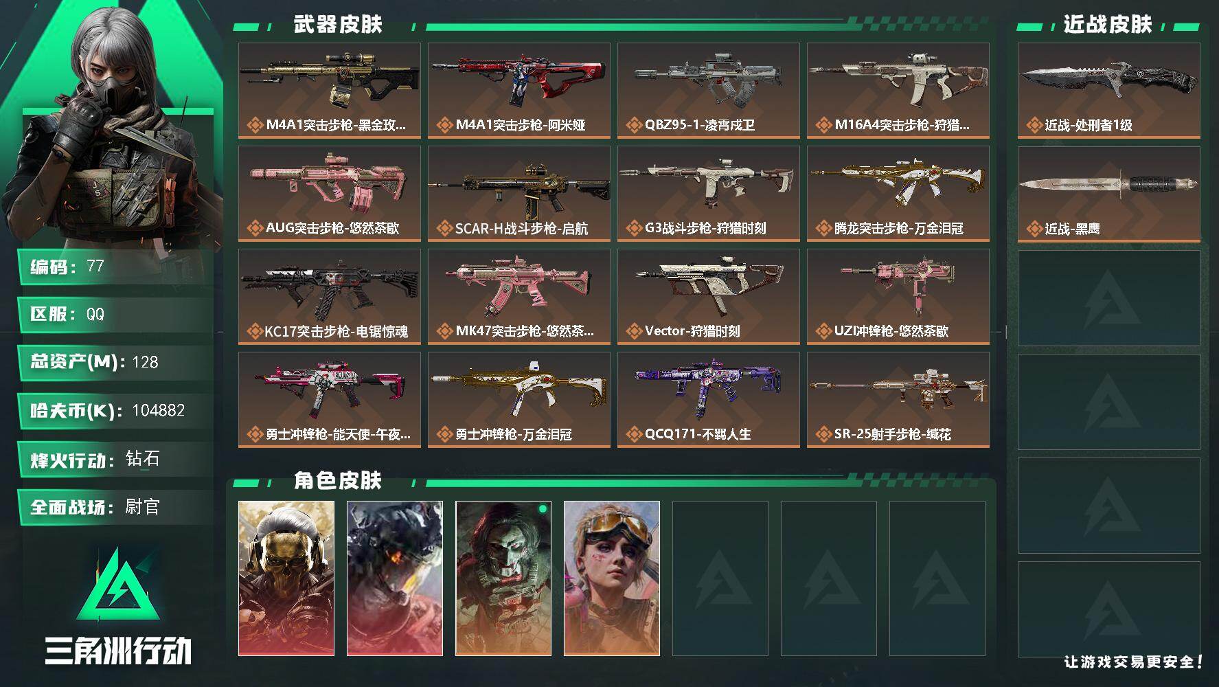128m总资产-104882k哈夫币-60烽火等级-钻石-50战场等级-尉官